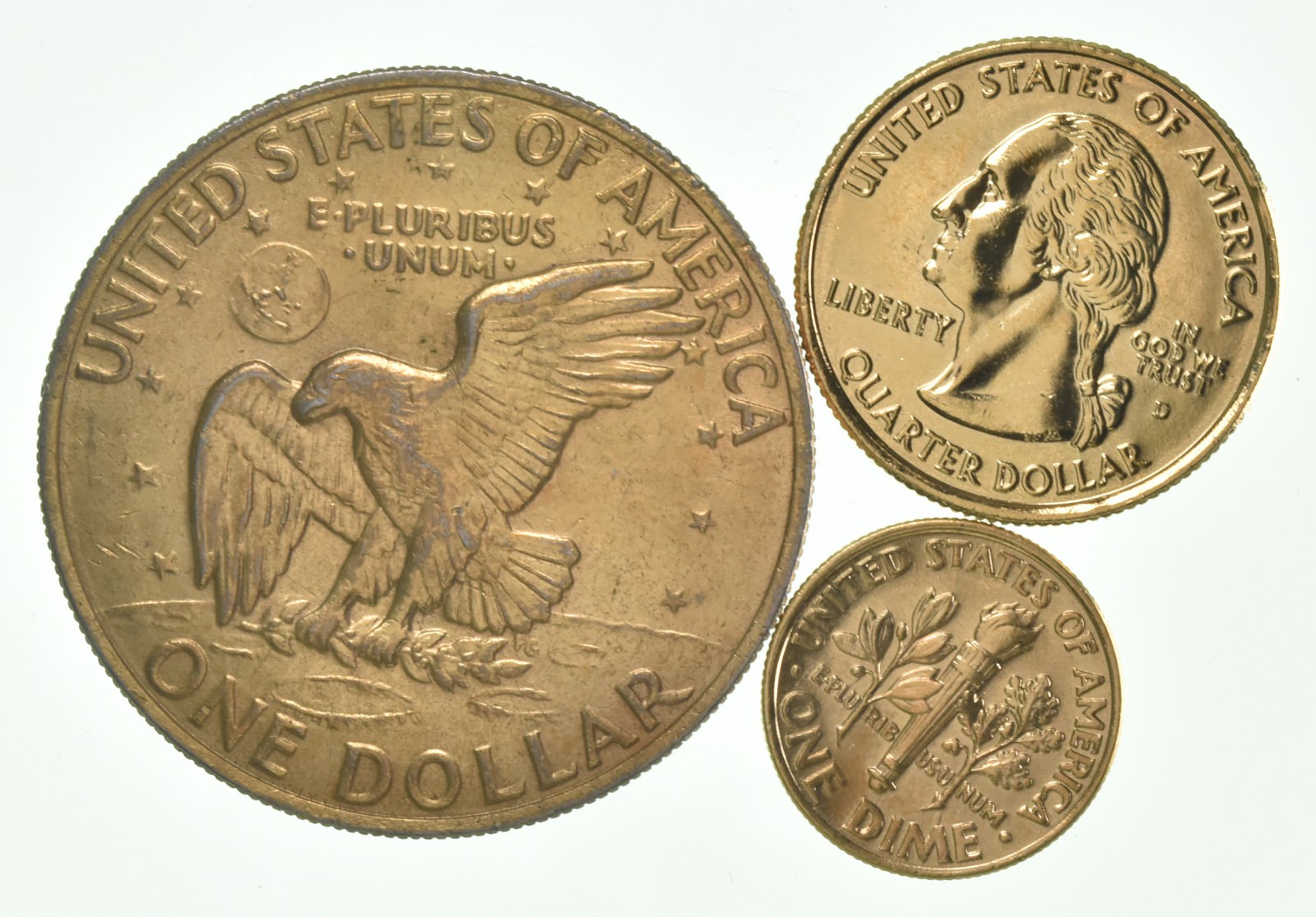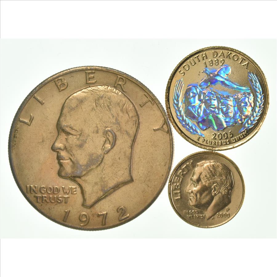 Solid 24K GOLD Plated Lot 1972 Eisenhower Dollar 2006 South Dakota State Quarter 2000 Roosevelt Dime