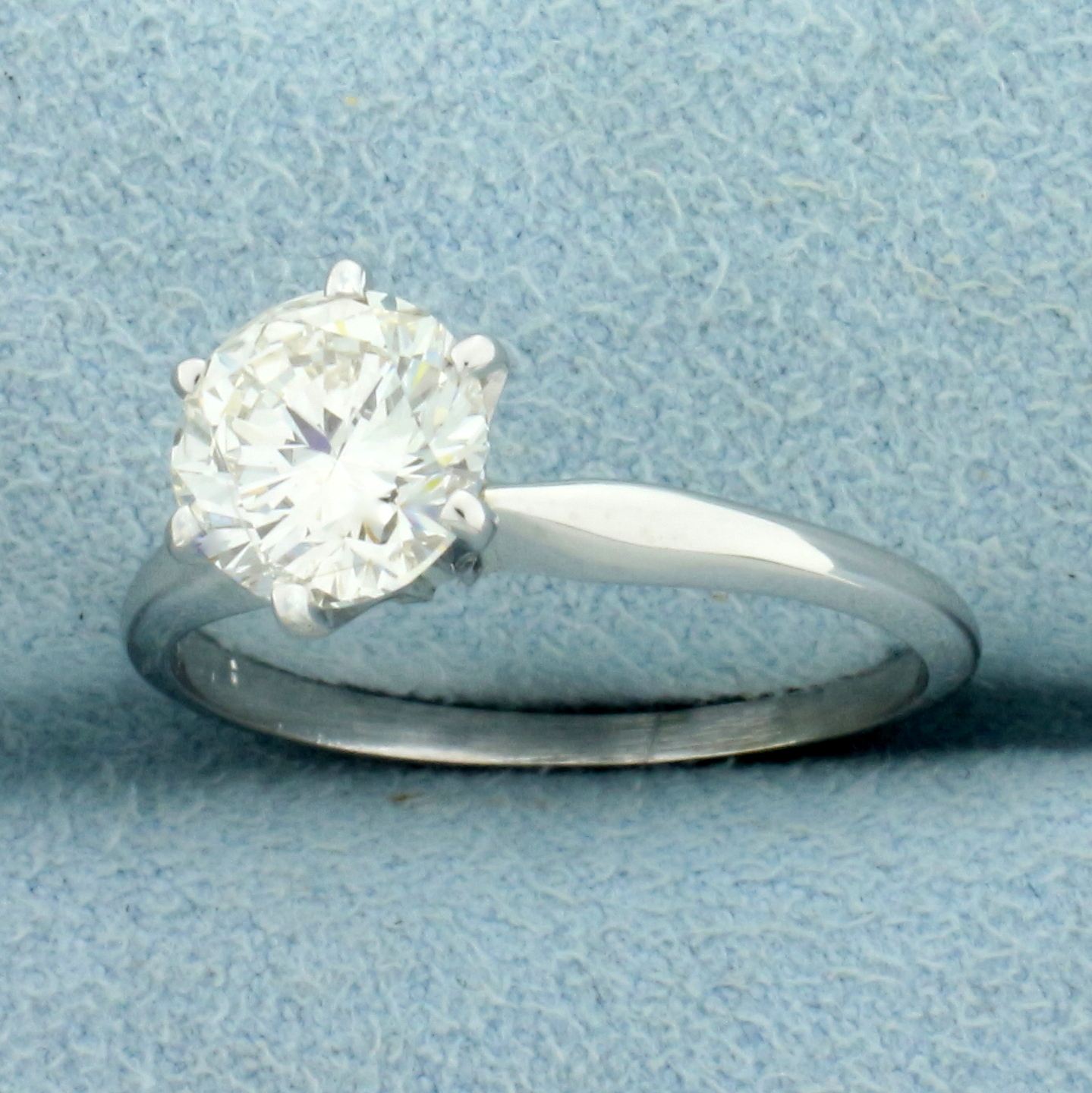 18k White Gold. Contains a 1.5ct Round Brilliant Diamond, J Color/SI Clarity, completely eye clean and great cut for lots of sparkle. Faces up very "white". Size 7.5. 2.7g.