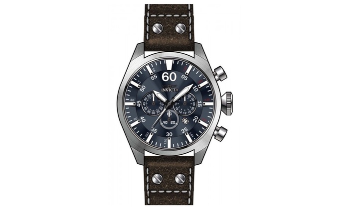 An aerodynamic addition to your timepiece collection, Invicta's Aviator flies through your time with a round stainless steel case and a matching fixed bezel. It's all system's go with a crown and function pushers navigating on the right and "Invicta" emblazoned on the left. The case finds its upright and locked position with a leather strap accented with white stitching and a distressed finish.