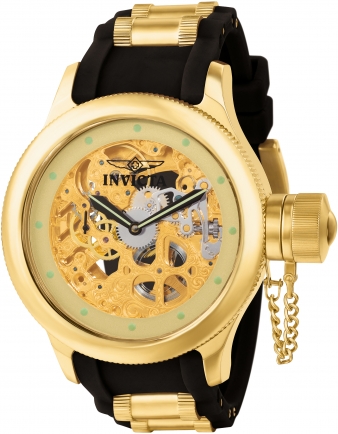 With the Polyurethane Invicta Analog Watch, you will have no trouble getting noticed. What sets this Russian Diver model apart is its large size making it that much easier to appreciate its regal design, which makes use of gold-tone stainless steel case and a skeleton dial that displays the timepiece in all its mechanical glory. The black urethane strap offers a comfy fit while the gold pumps up the chic factor.