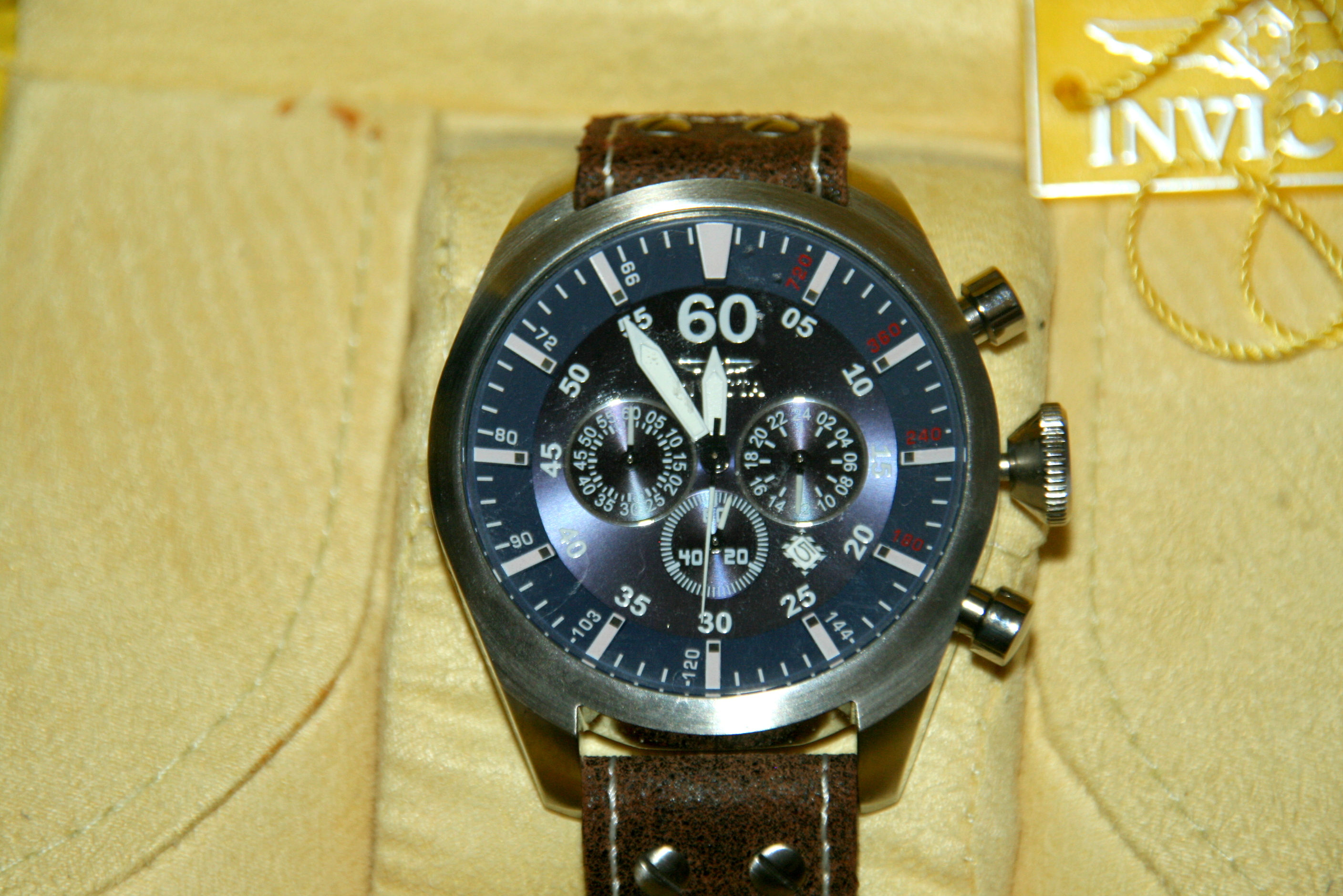 A round dial takes your time to new heights with a 24-hour subdial near 3:00, a date window near 5:00, a 60-seconds subdial above 6:00 and a 60-minute subdial near 9:00. It gauges your schedule and your style with luminous Tritnite accented index markers at the hour positions and Arabic numerals at five-minute increments. You're cleared for takeoff with a Tritnite-filled hour and minute hands as "Invicta" and its logo come in for a cool landing above them.