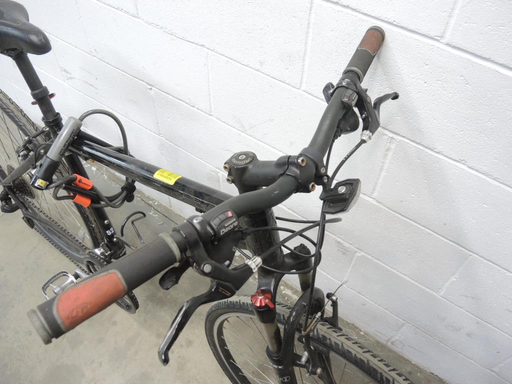 - Front fork suspension, water bottle holder. A bike lock is currently attached to the frame.