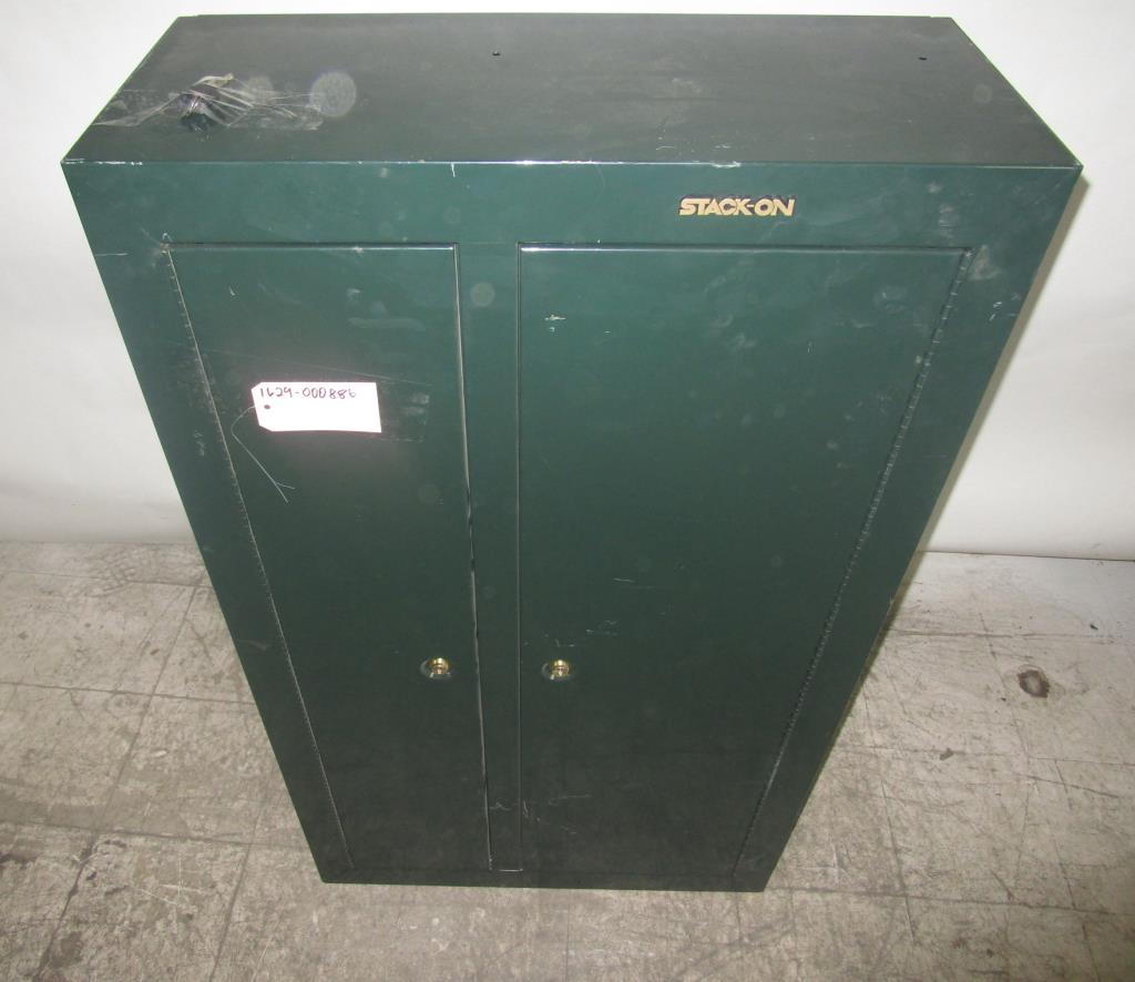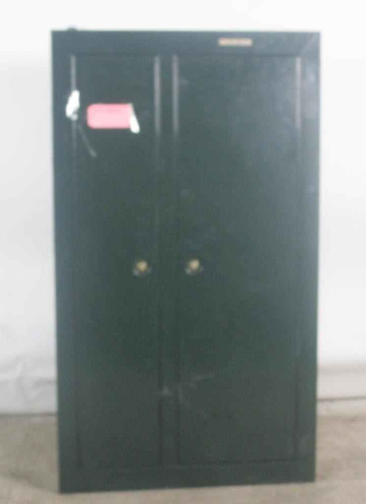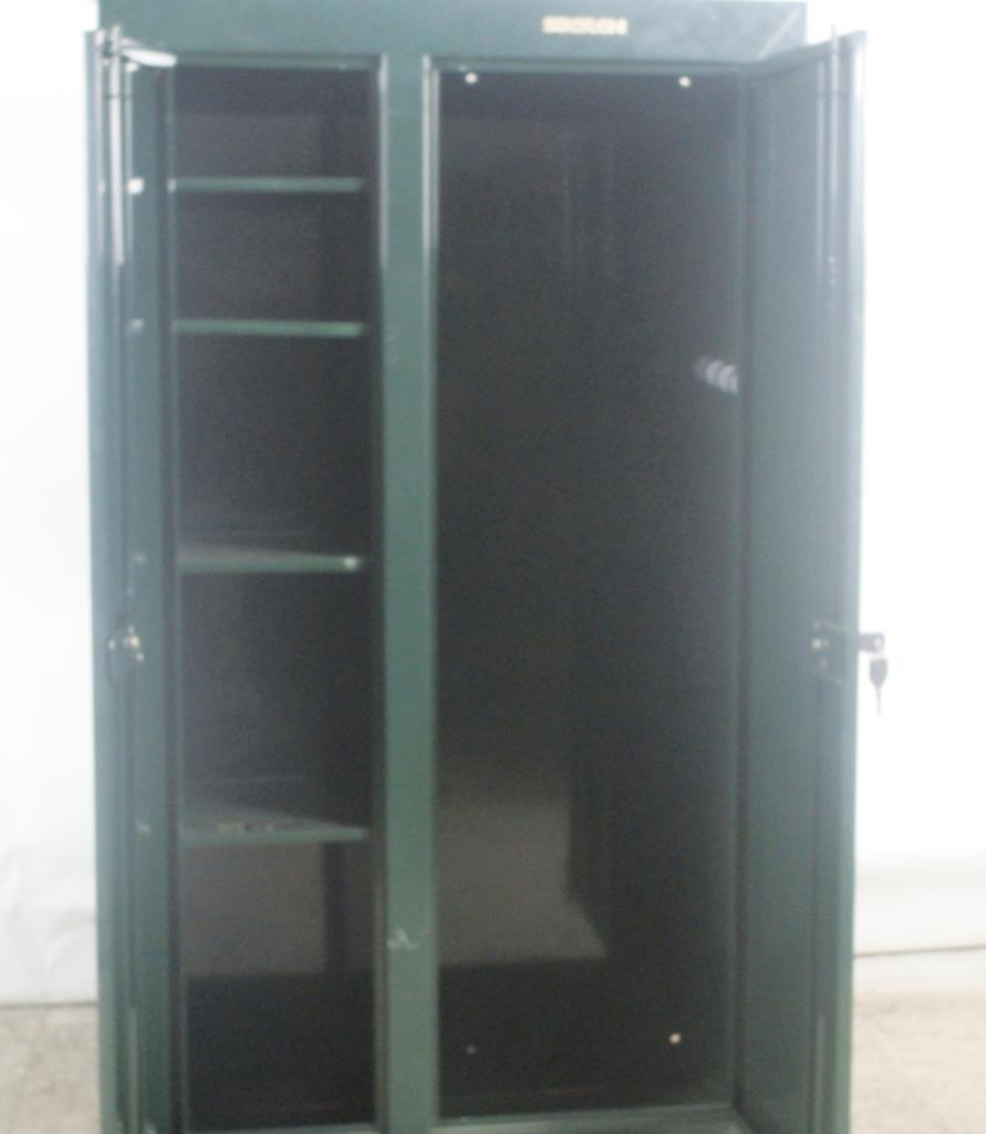 - Dual door key lock gun safe, left door has 4 shelves, right door stores 10 rifles, molded rifle barrel rests, Locks for each door.