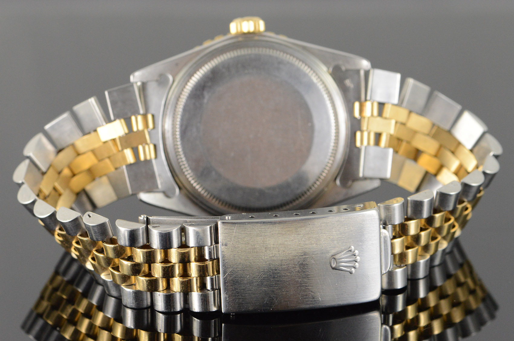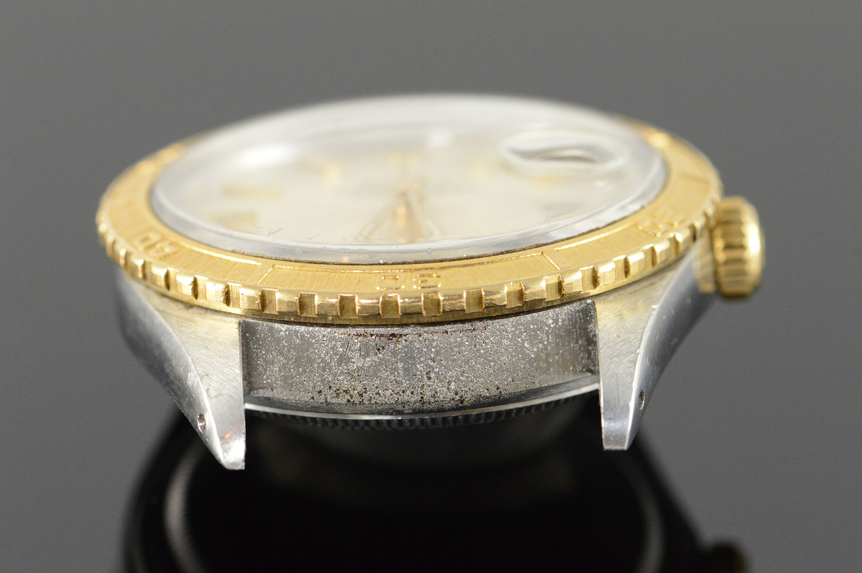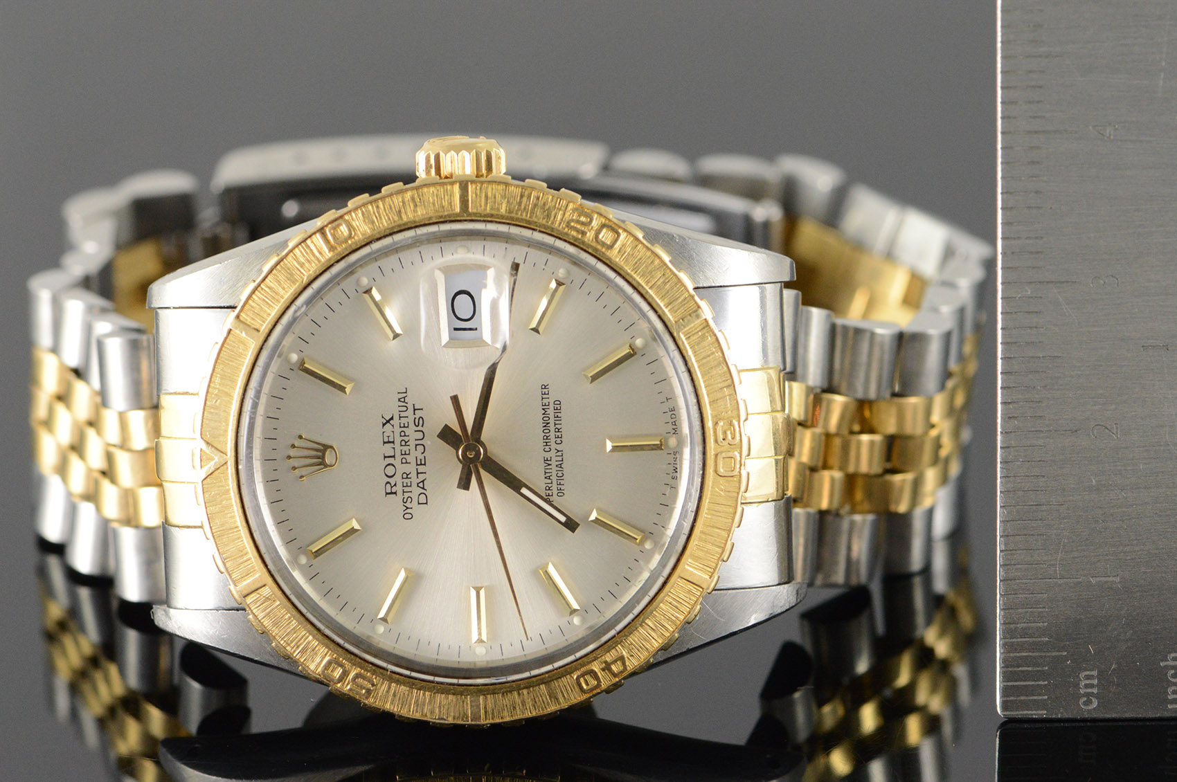 Item:  Stainless / 18K 103.8g 36mm Rolex Datejust Thunderbird 16253 Silver Dial Men's Watch Yellow Gold Model 16253, Serial corroded/unreadable, Jubilee bracelet at 20%, No box or Papers