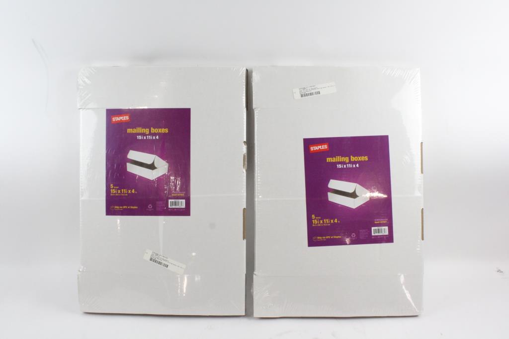 Get a great deal with this online auction for mailing boxes and packing peanuts presented by Property Room on behalf of a law enforcement or public agency client. - Staples mailing boxes, 427857, 5 pack, 15-1/8" x 11-1/8" x 4"