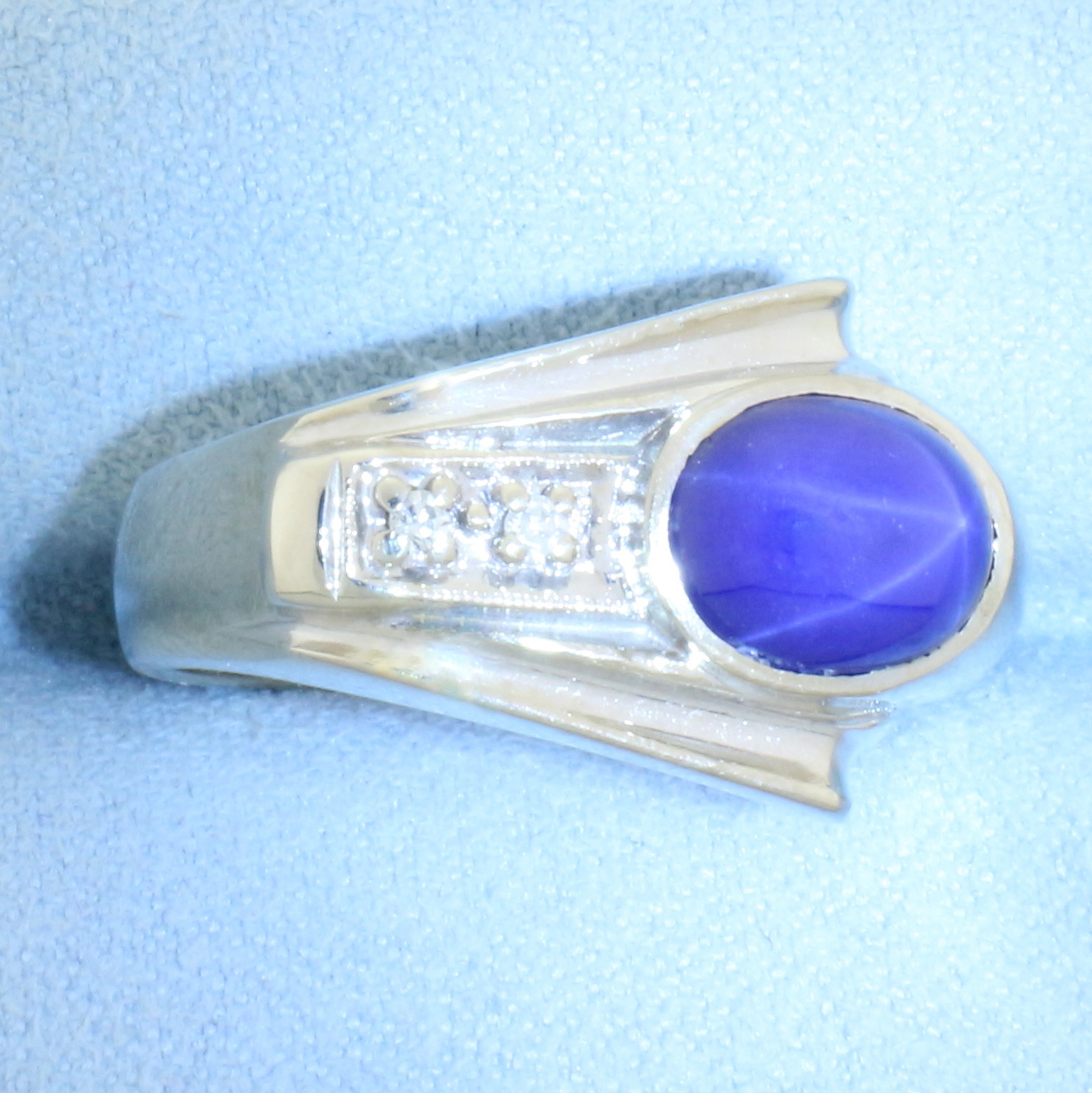 In 14k white gold. Contains one 9x7mm oval cabochon star sapphire gemstone with very visible "star" under light. Also contains two .01ct high quality diamonds, SI clarity/H color. Size: 9.75. 8.9g.