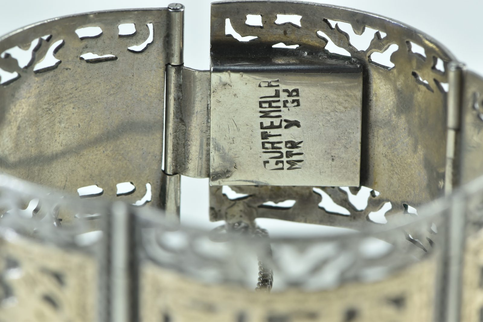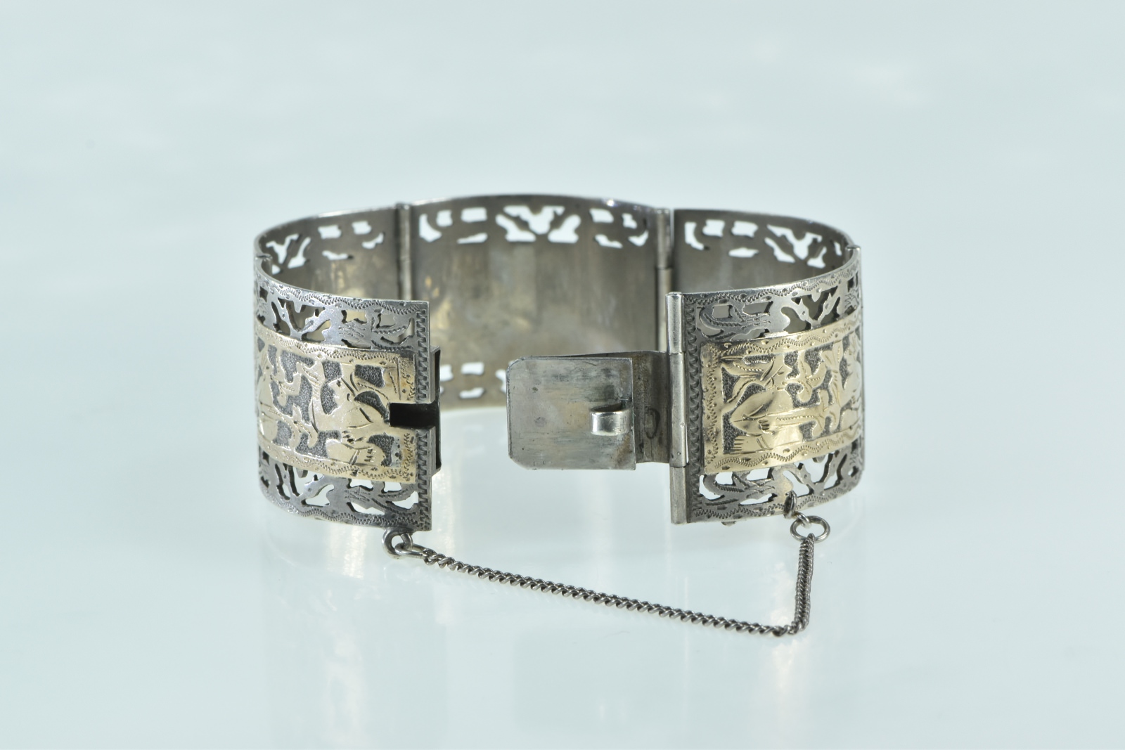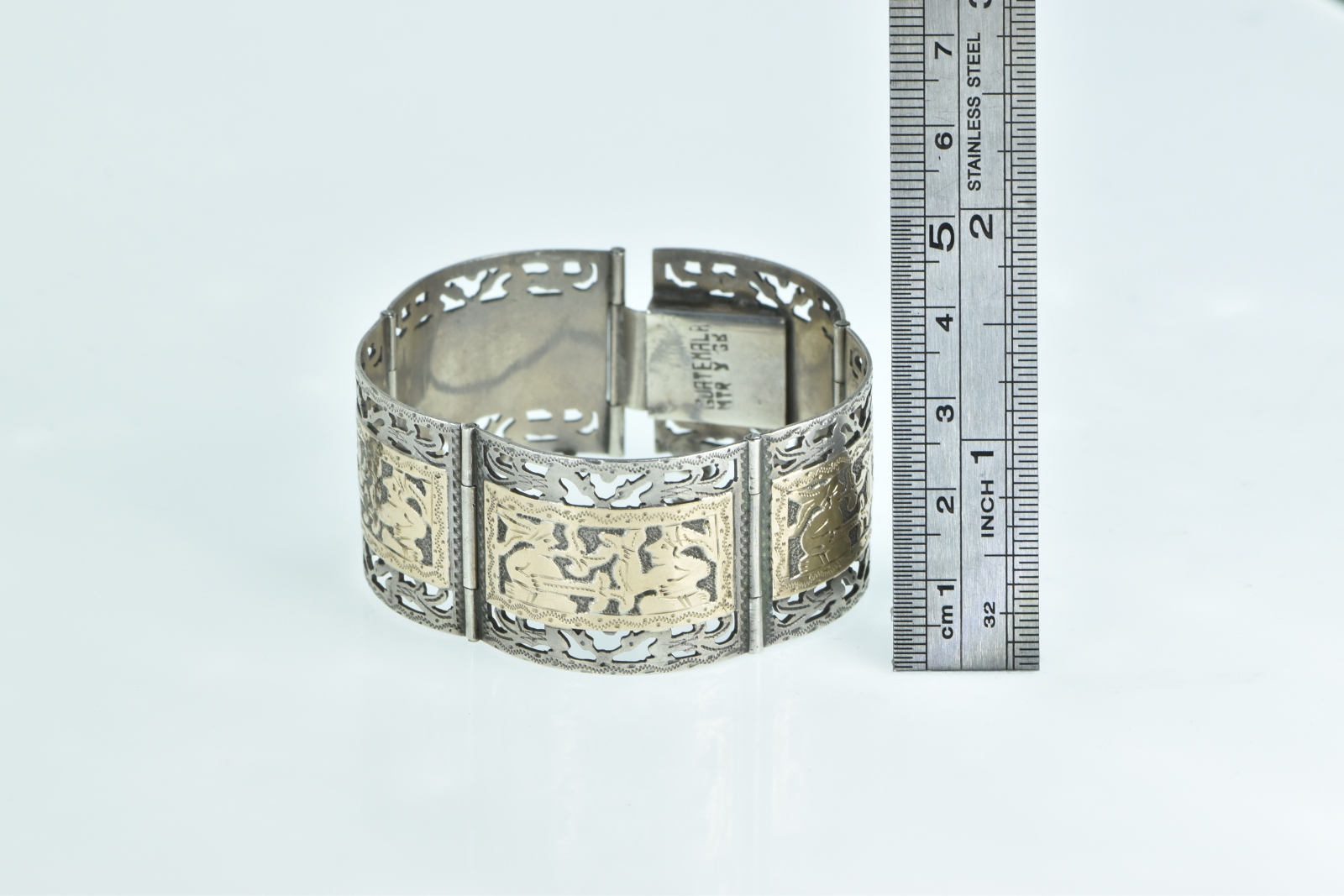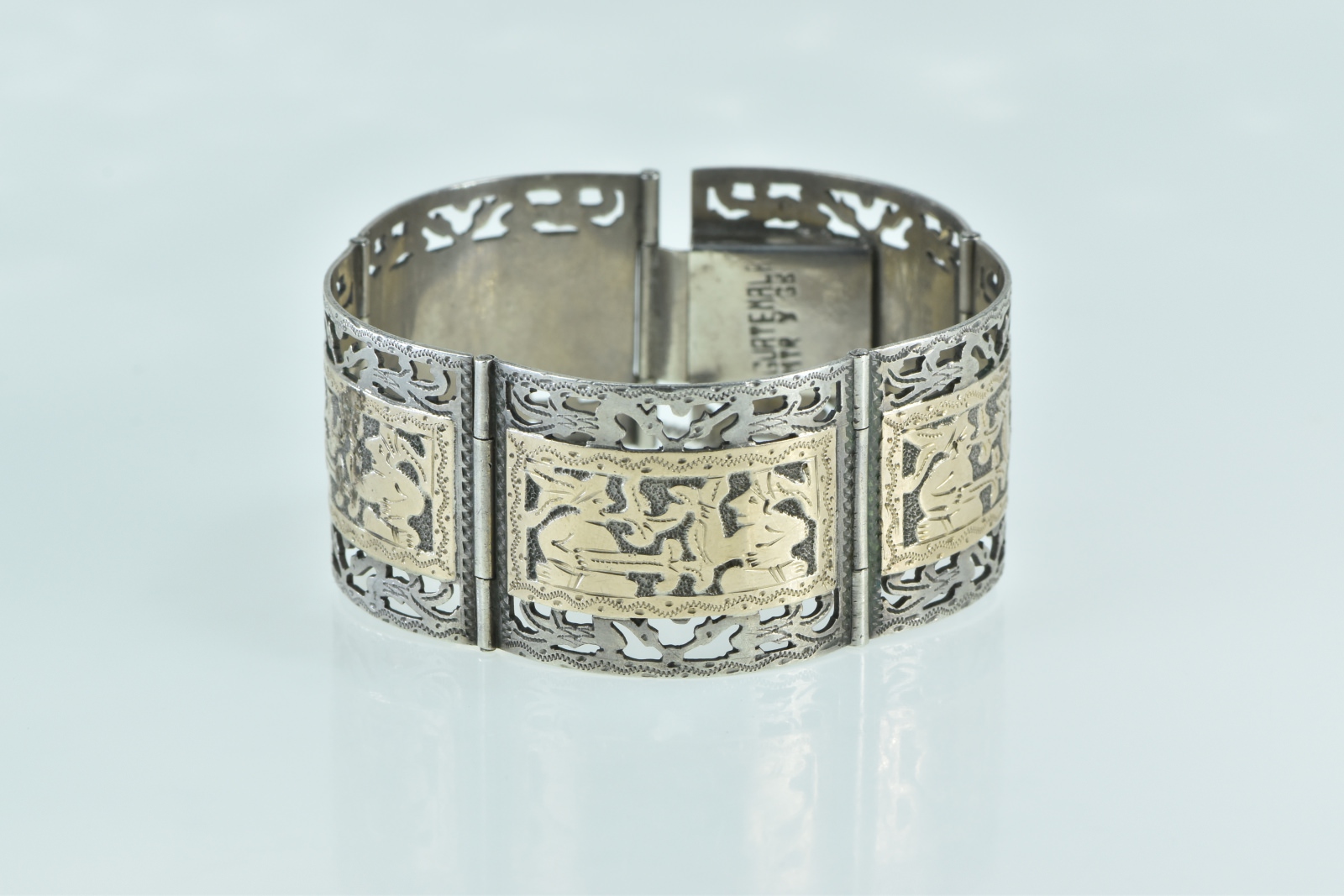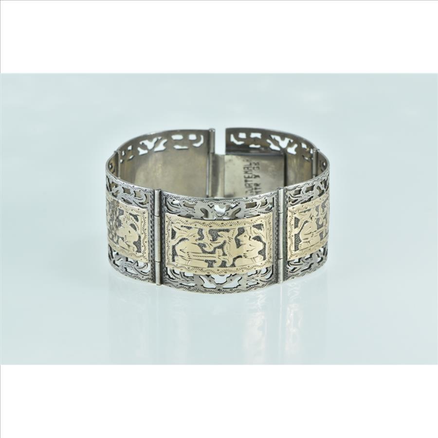 Item:  Sterling Silver 14k Gold Incan Tribal Motif Ornate Filigree Bracelet 6.5"