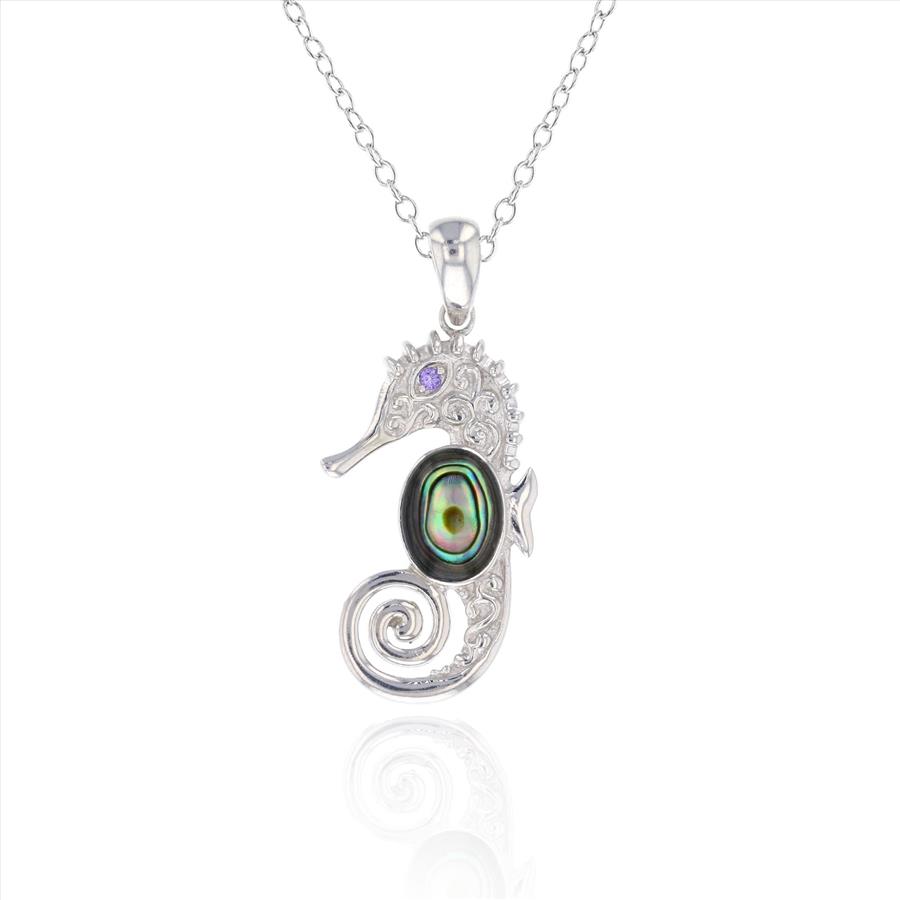 Sterling Silver Abalone Seahorse, Amethyst CZ Eyes Pendant with Chain