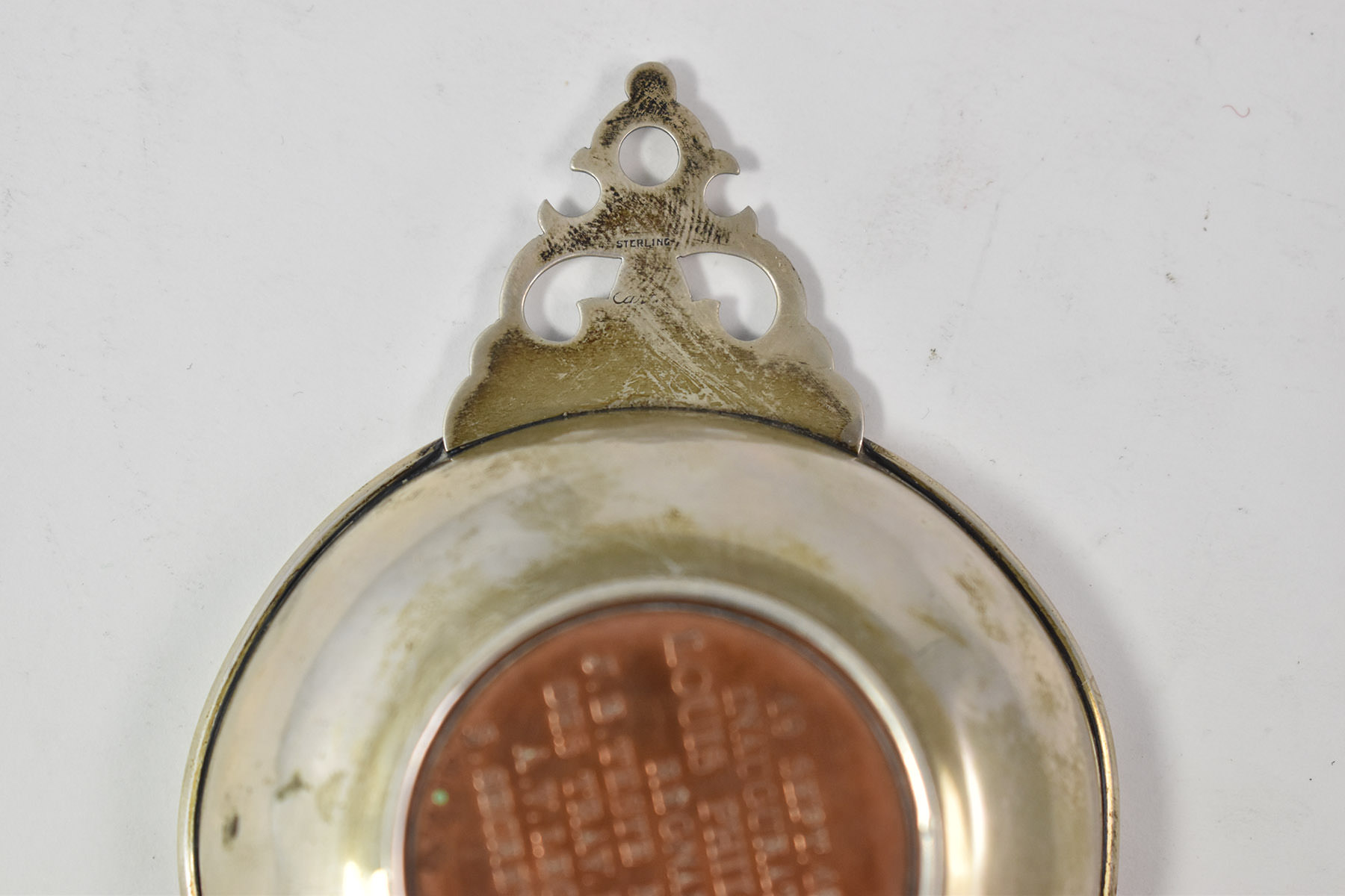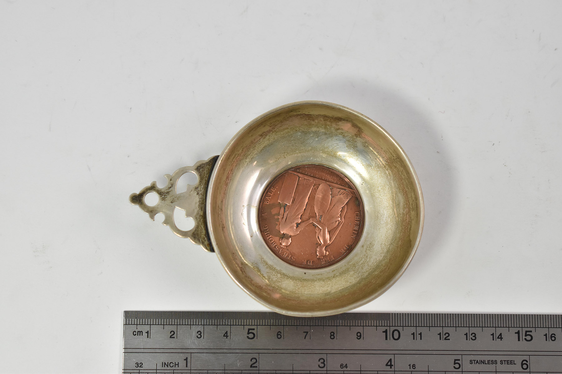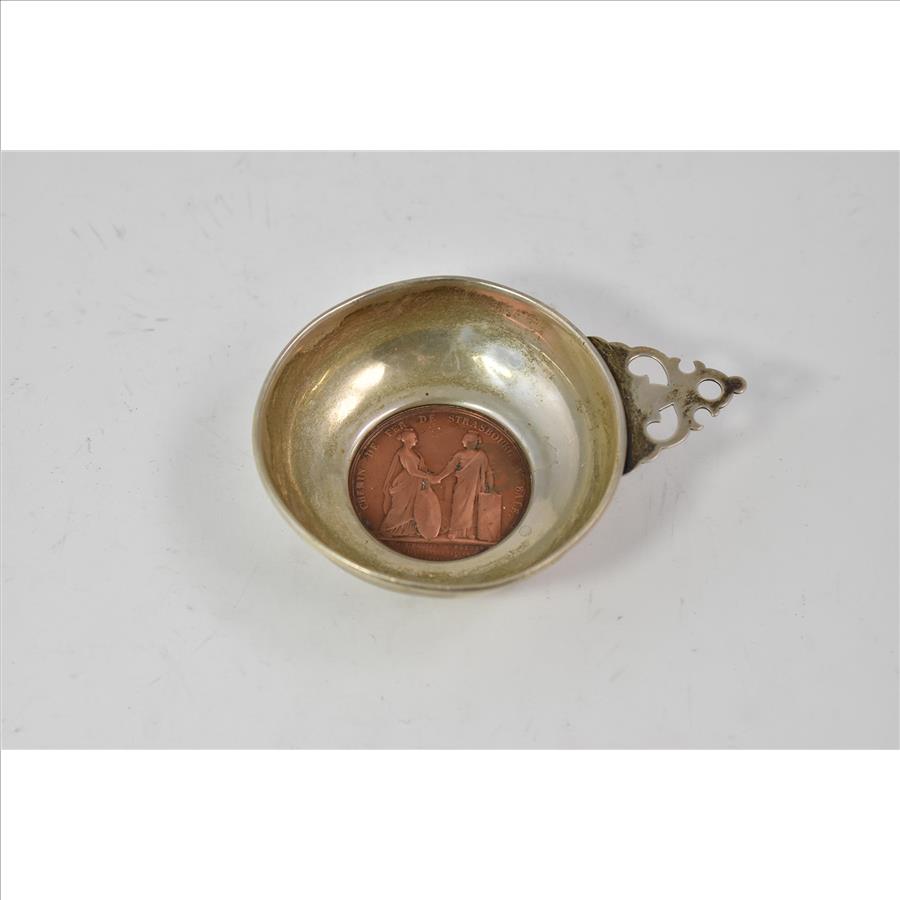 Item:  Sterling Silver Cartier 1841 France Railway Copper Medal Baby Porringer