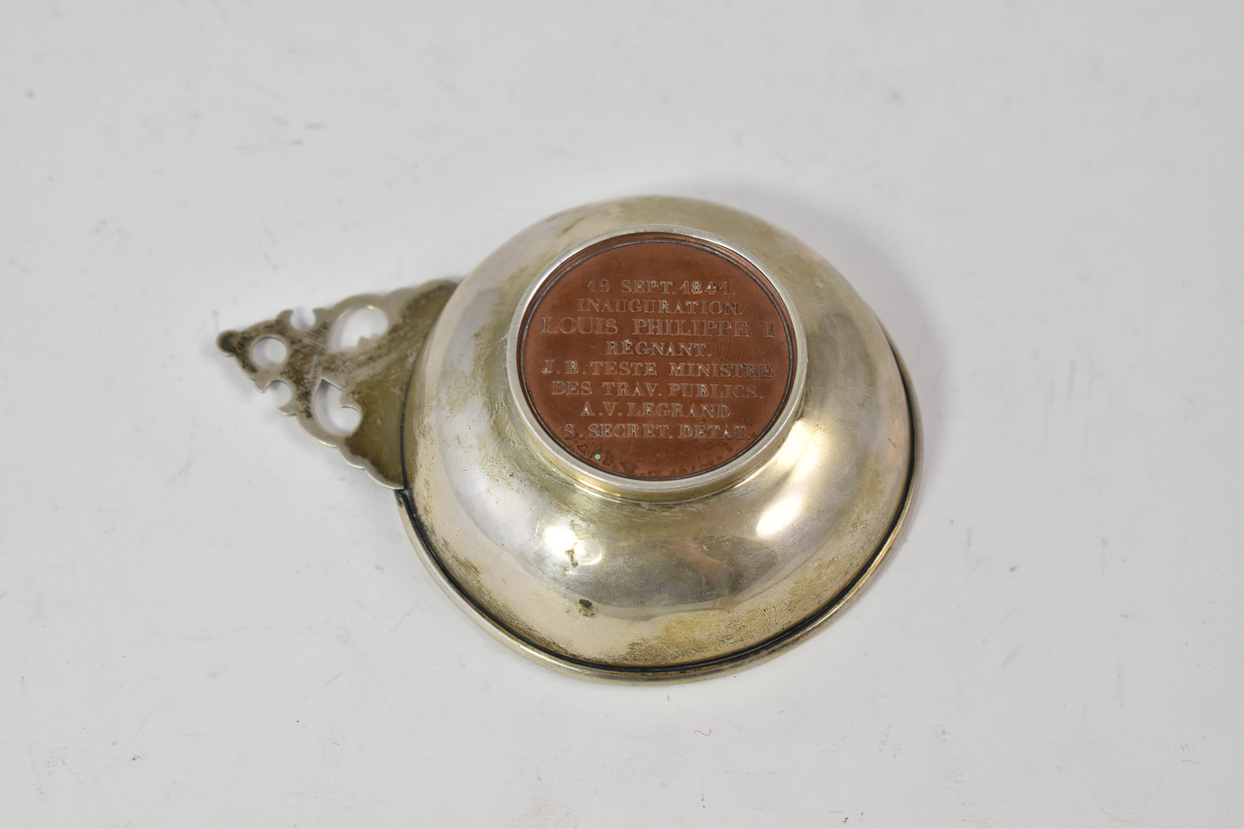 Notes:  The medal in the center is made of copper. Description of medal - Face: Figure of Strasbourg shaking hand of the figure of Bale - Obverse: CHEMIN DE FER DE STRASBOURG A BALE, 19 SEPT 1841 / INAUGURATION / LOUIS PHILIPPE I / RÉGNANT / J. B. TESTE MINISTRE / DES TRAV PUBLICS / A V LEGRAND / S SECRET D'ETAT.