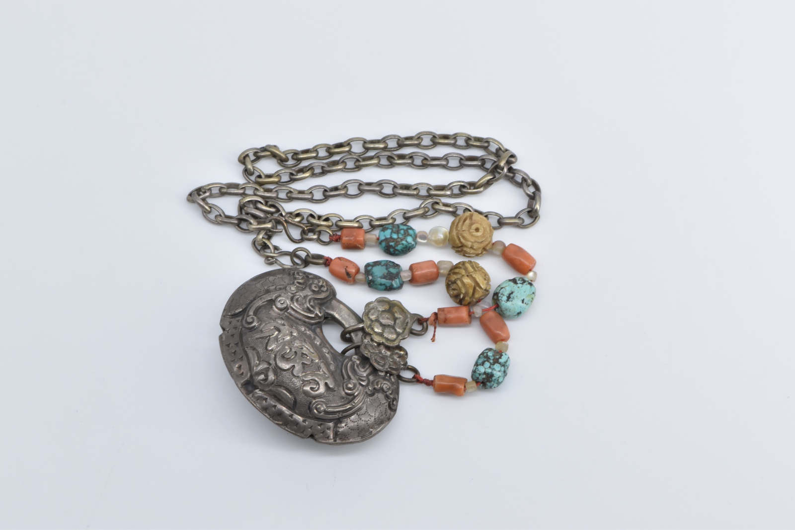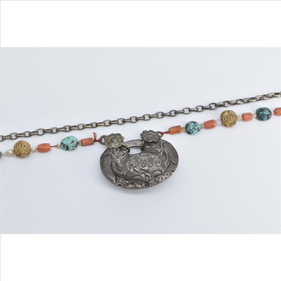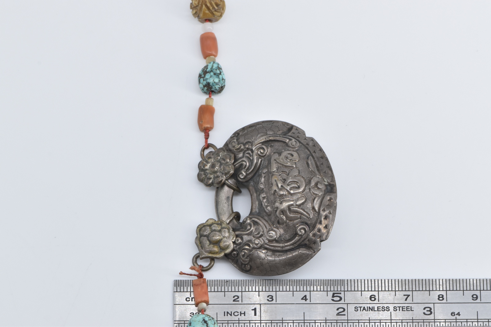 Item:  Sterling Silver Coral Turquoise Mangalsutra Ornate Necklace 16.75"