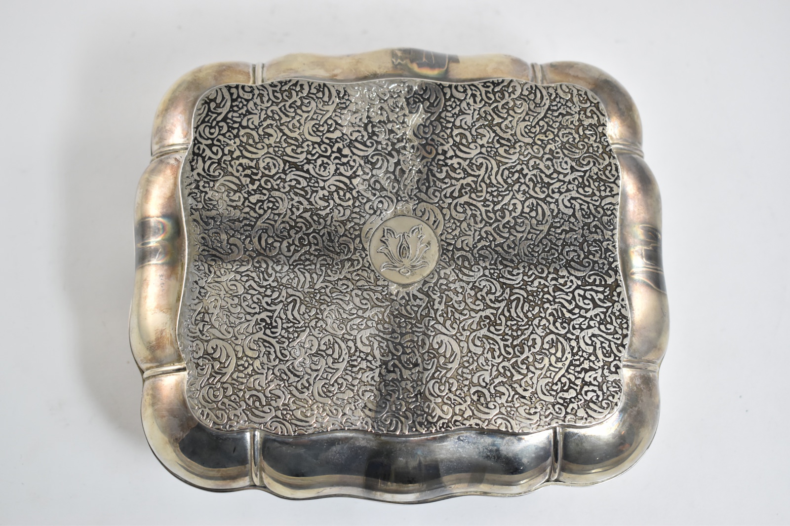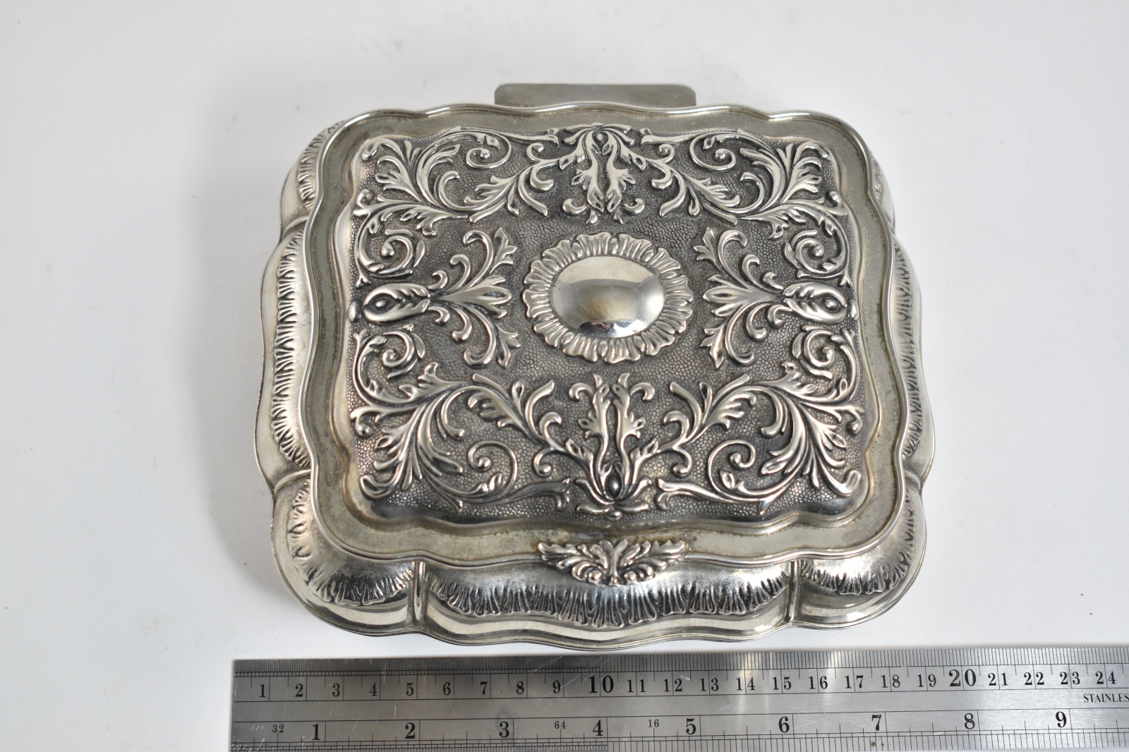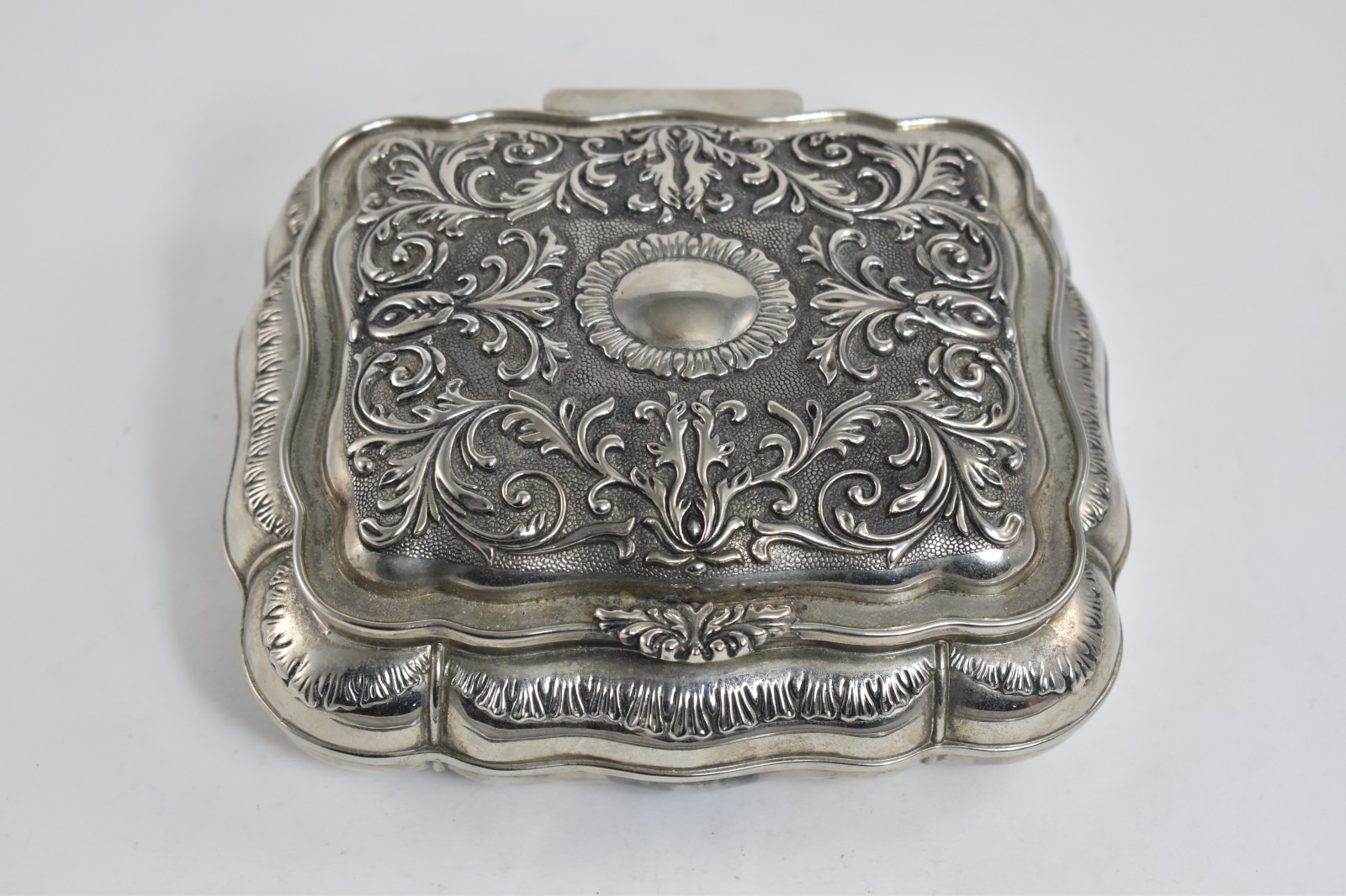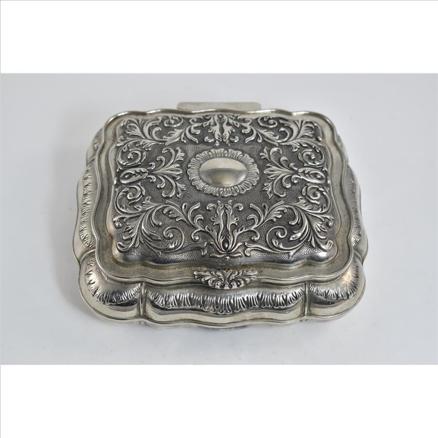 Item:  Sterling Silver Elaborate Scroll Work Red Velvet Lined Jewelry Box