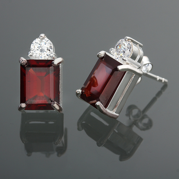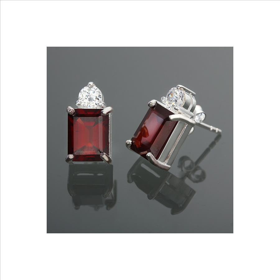 Sterling Silver Emerald Cut Garnet & White Cz Stud Earrings