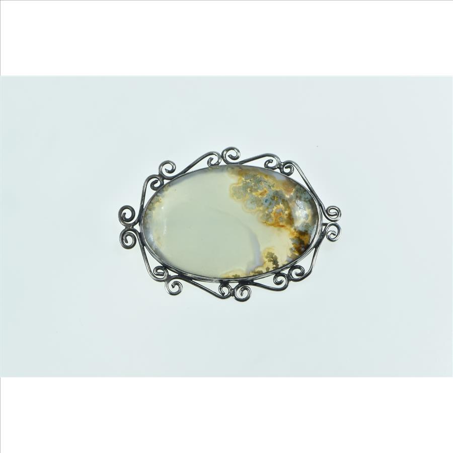 Item:  Sterling Silver Oval Moss Agate Scroll Filigree Statement Pin/Brooch
