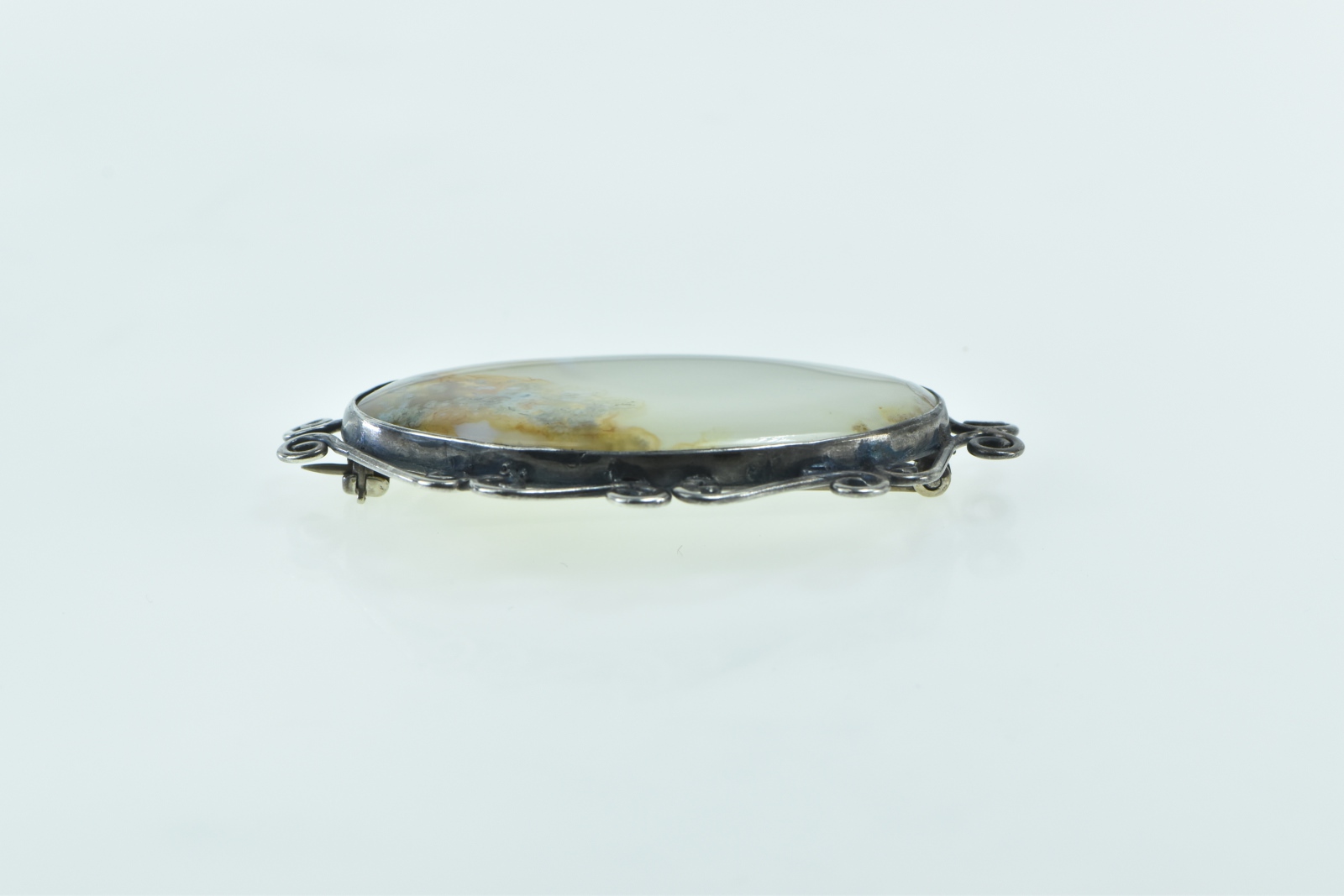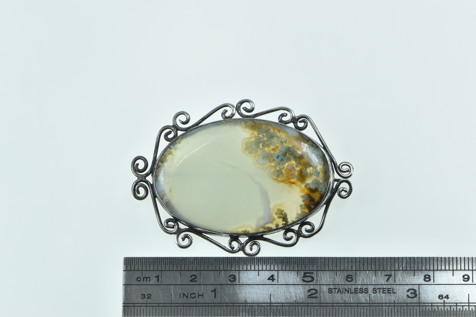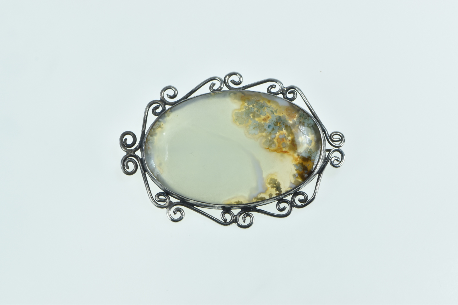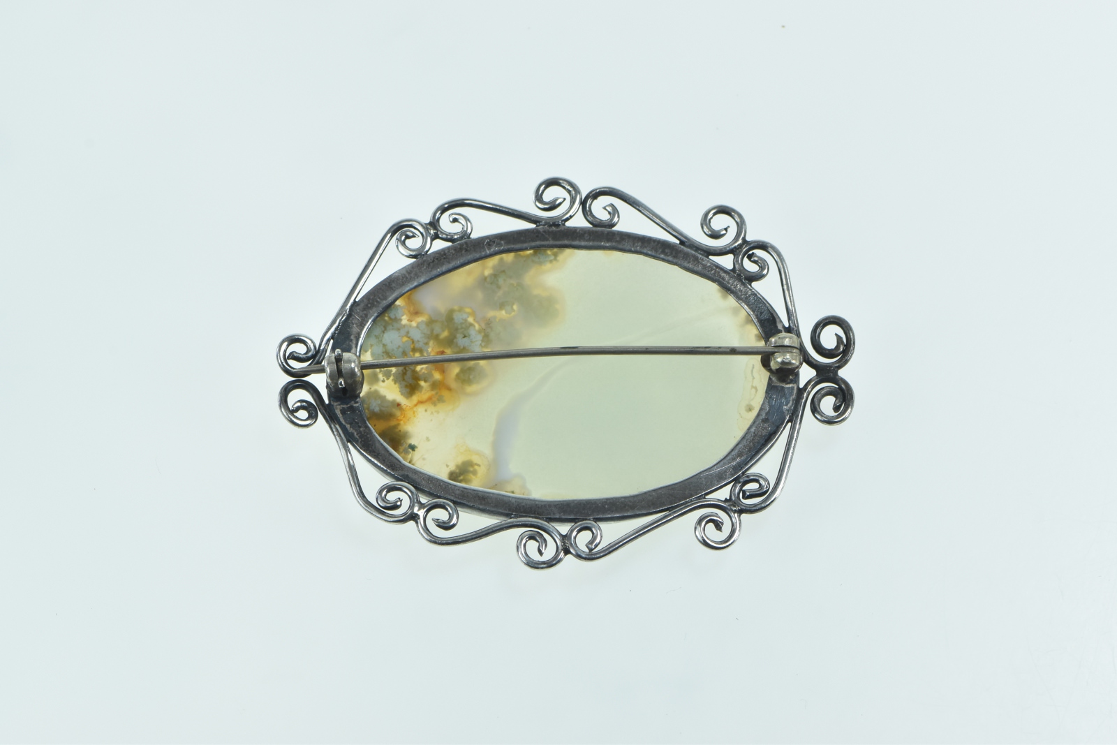 Sterling Silver Oval Moss Agate Scroll Filigree Statement Pin/Brooch