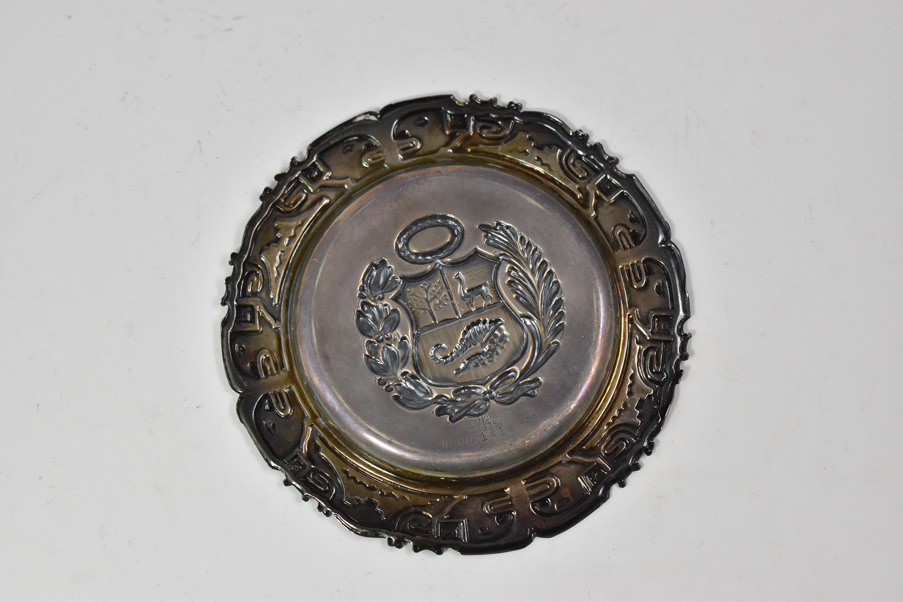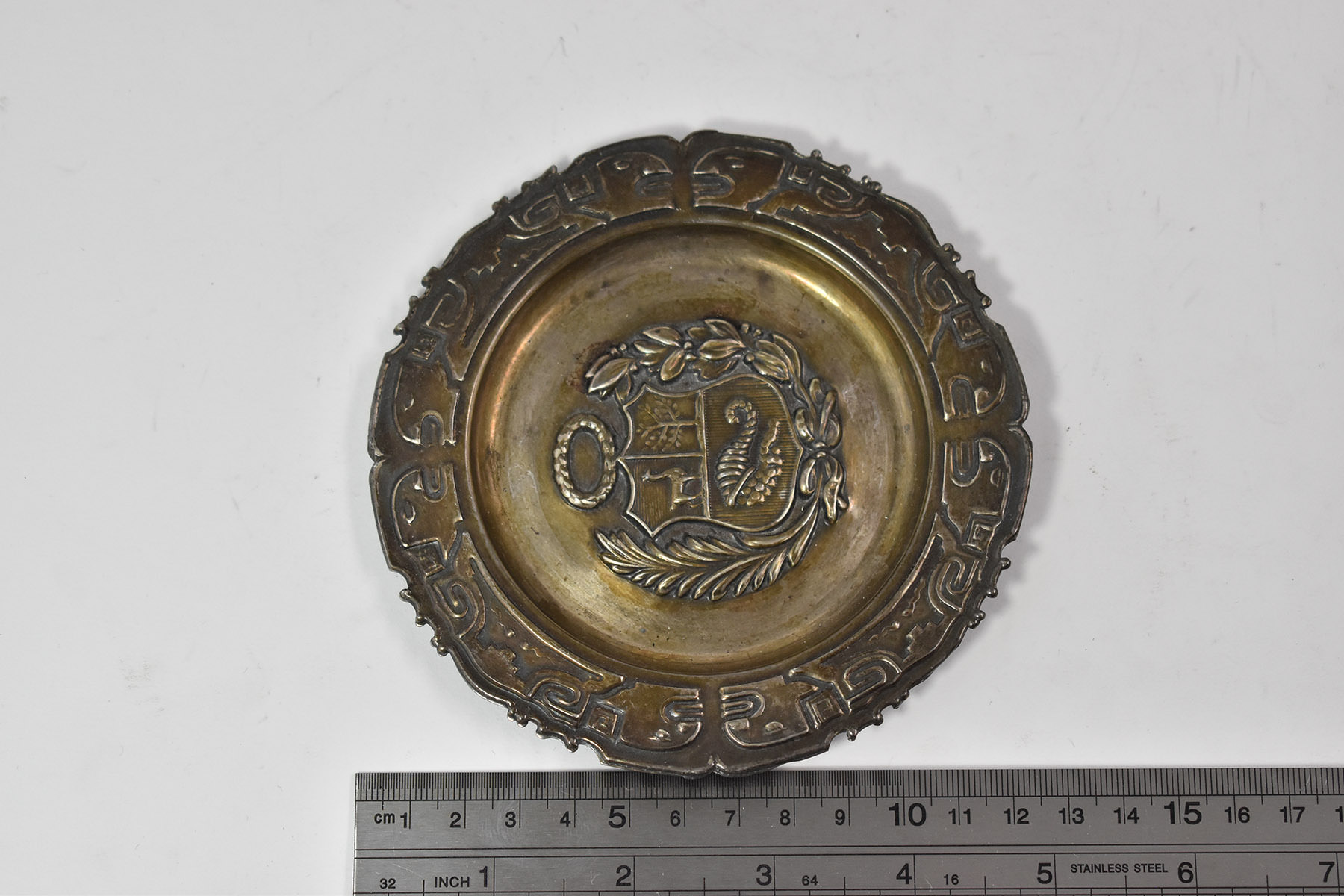 Item:  Sterling Silver Peruvian Coat of Arms Ornate Repousse Ash Tray