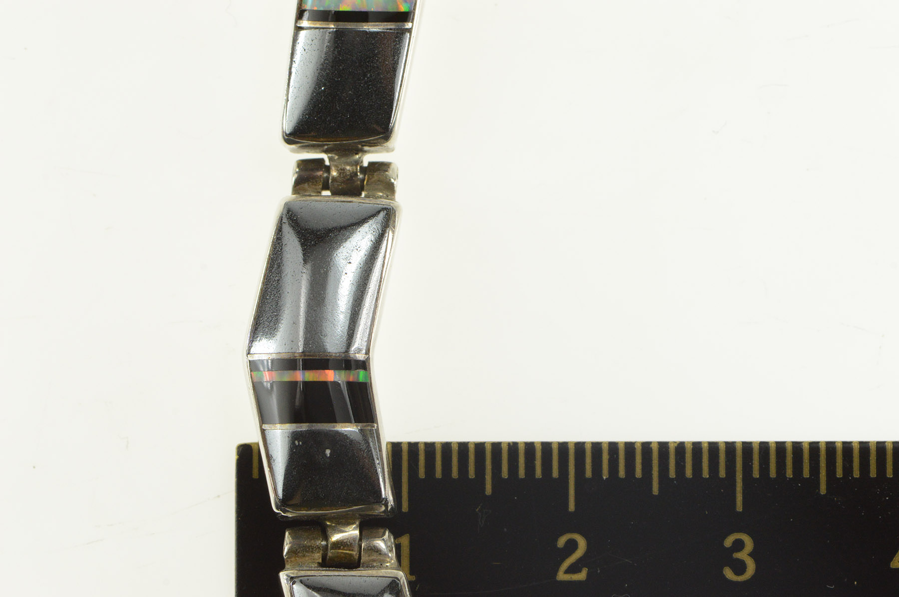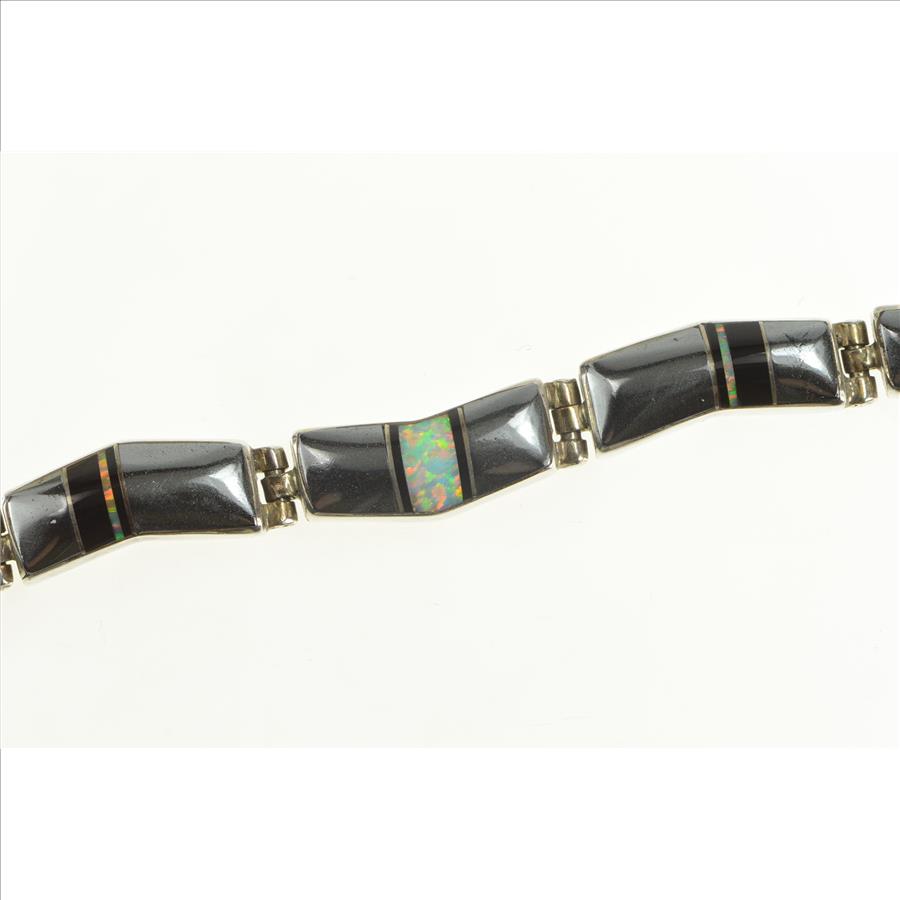 Item:  Sterling Silver S Tso Navajo Hematite Onyx Opal Zig Zag Bracelet 6.75"