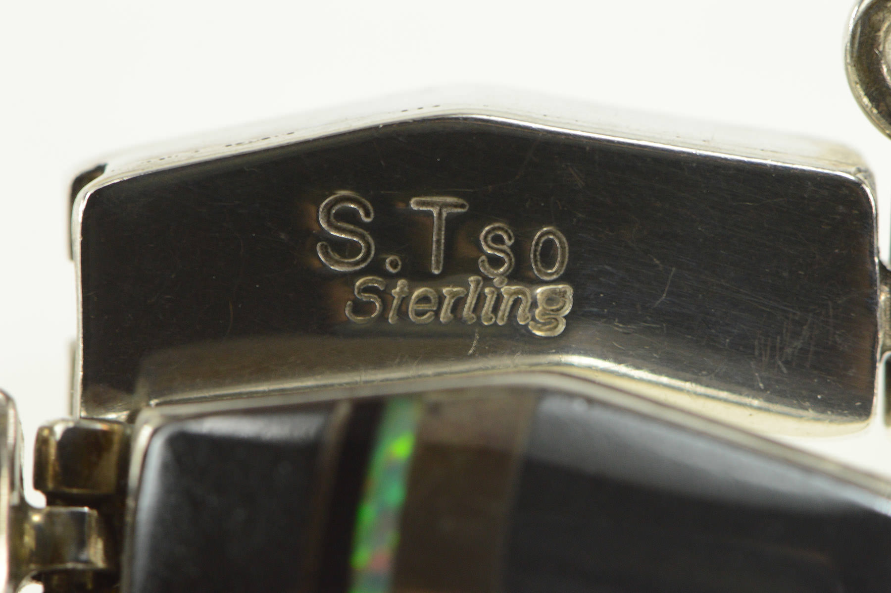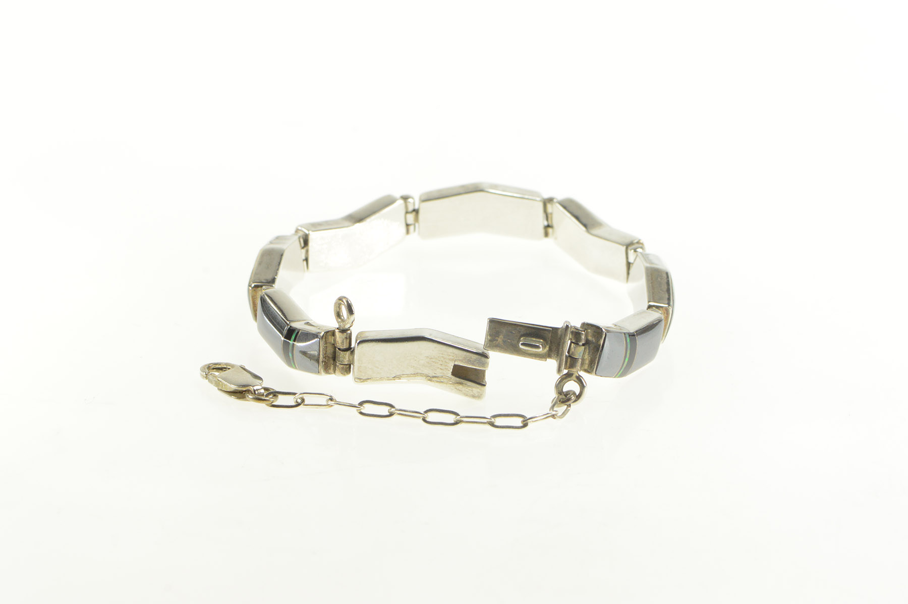 Item:  Sterling Silver S Tso Navajo Hematite Onyx Opal Zig Zag Bracelet 6.75"