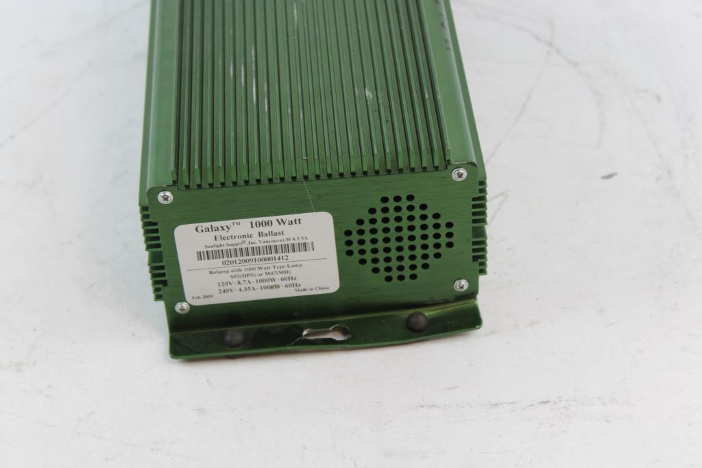 Get a great deal with this online auction for a ballast presented by Property Room on behalf of a law enforcement or public agency client. Model:Sunlight Supply Galaxy 1000W Electronic Ballast Watts: 1000W Type: Metal Halide or High Pressure Sodium [120V/240V] / [60Hz] / [8.7A/4.35A] Measurements: Approx 14"L x 6 3/8"W x 4 1/4"H Cosmetic Condition: Good to fair condition, visibly worn, very dirty, has scratches, scuffs, dents and scrapes. Mounting brackets may be bent or warped Power Cord Condition: Not Cut - Testing Results: Item is untested due to lack of proper testing equipment.