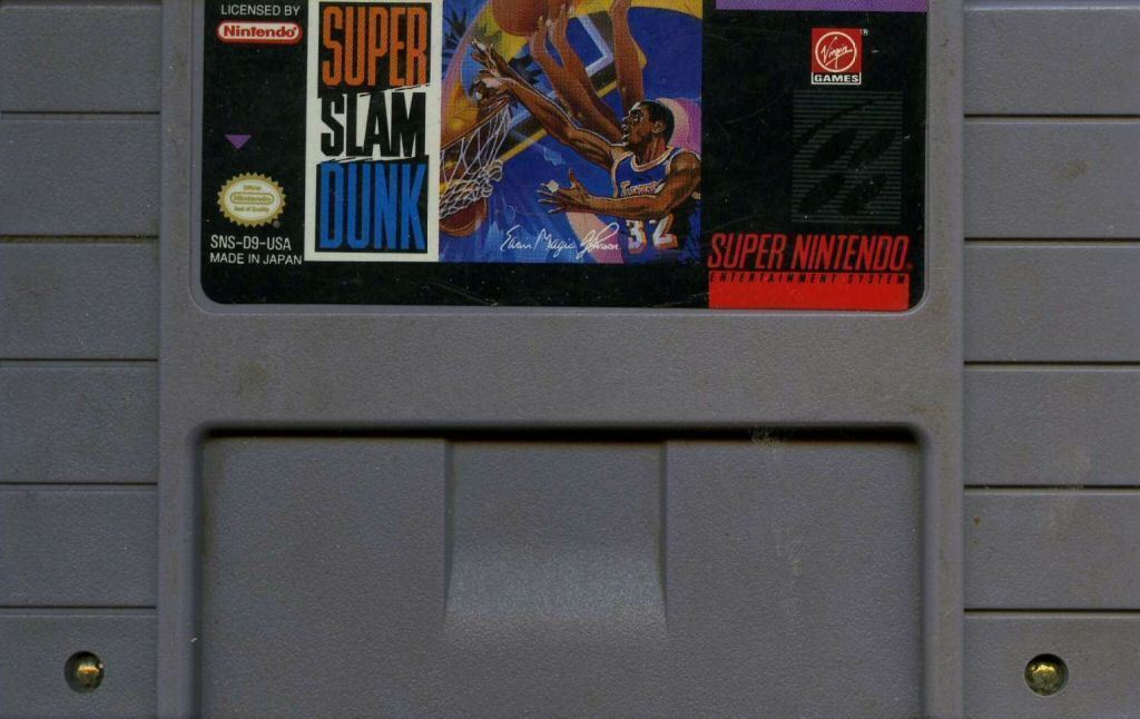 Super Slam Dunk is a professional-style basketball game without an NBA license for real teams and players. Instead, the title's 22 teams are identified by city name. Legendary star Magic Johnson offers onscreen advice and tips while broadcaster Chick Hearn voices the play-by-play commentary. The defining aspect of Super Slam Dunk is its visual approach. Instead of featuring a traditional horizontal display, the court is viewed from a perspective looking toward the basket. Changing possession will rotate the camera 360° until the basket is once again in the center of the screen. Three play modes include Exhibition, Playoff, and All-Star, with progress throughout the playoffs resumed via passwords.Condition: Good