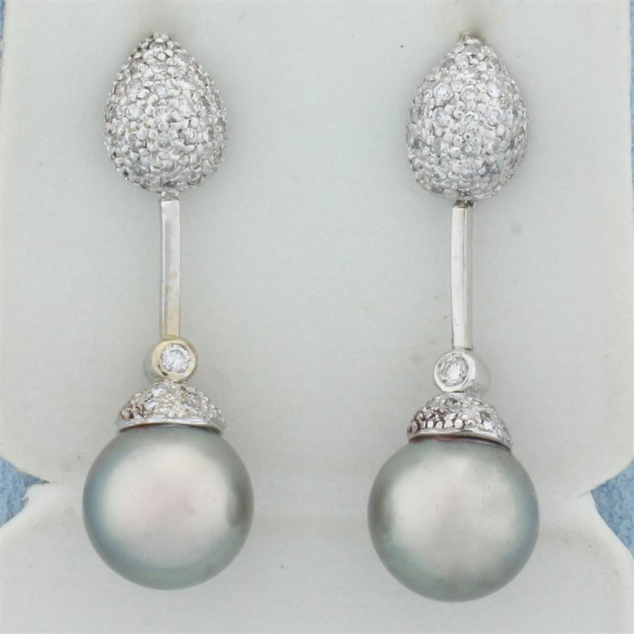Tahitian Pearl and Pave Diamond Dangle Earrings in 18k White Gold