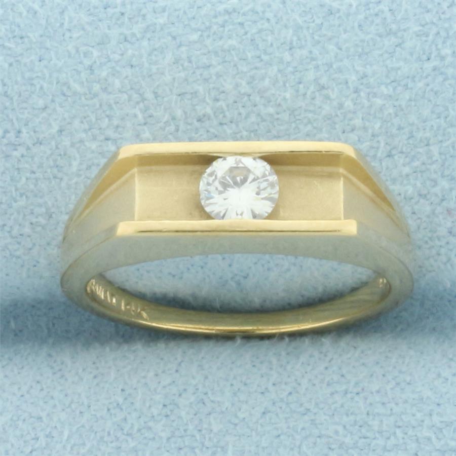 In 14k yellow gold. Contains one high quality 1/4ct round brilliant diamond, VS clarity/G color, great cut for added brilliance. Matte and High polish finish details. 5.2mm wide at top. Size: 5. 3.6g.