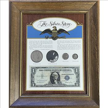 "The Silver Story" Framed Set w/Morgan Silver Dollar, Silver Granuels, Silver War Nickel, Silver Dime & 1935E $1 STAR NOTE REPLACEMENT ERROR Silver Certificate