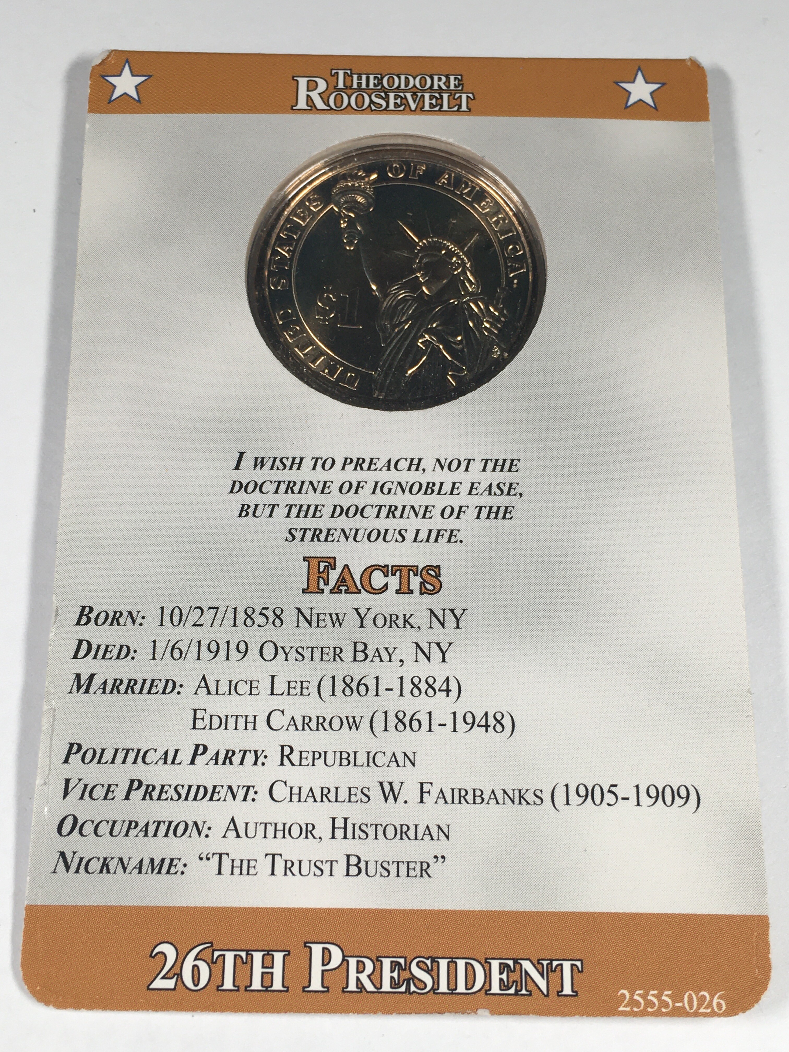 Theodore Roosevelt Presidential Commemorative Dollar*Brilliant Uncirculated*Facts Card