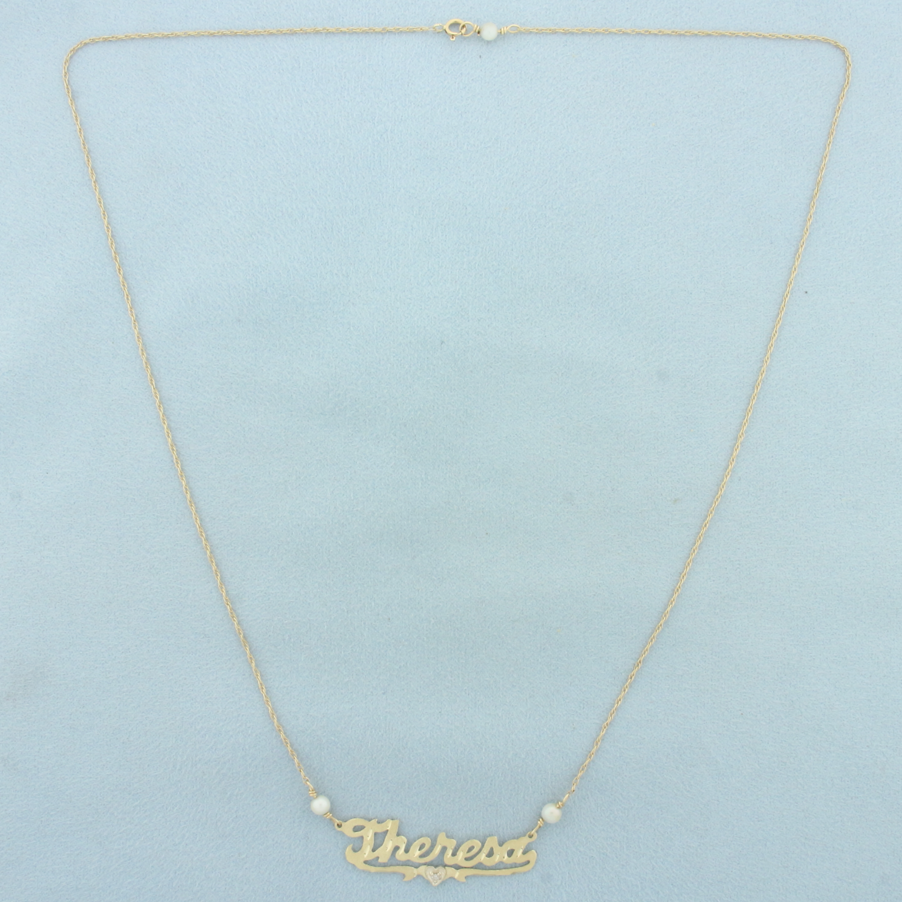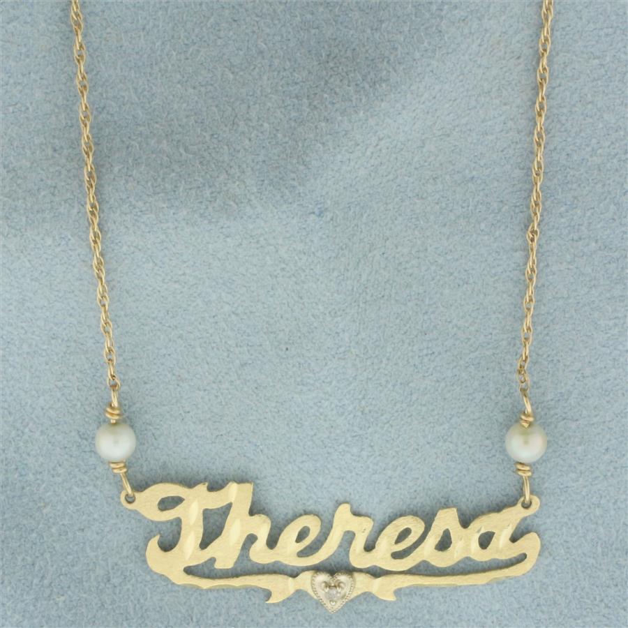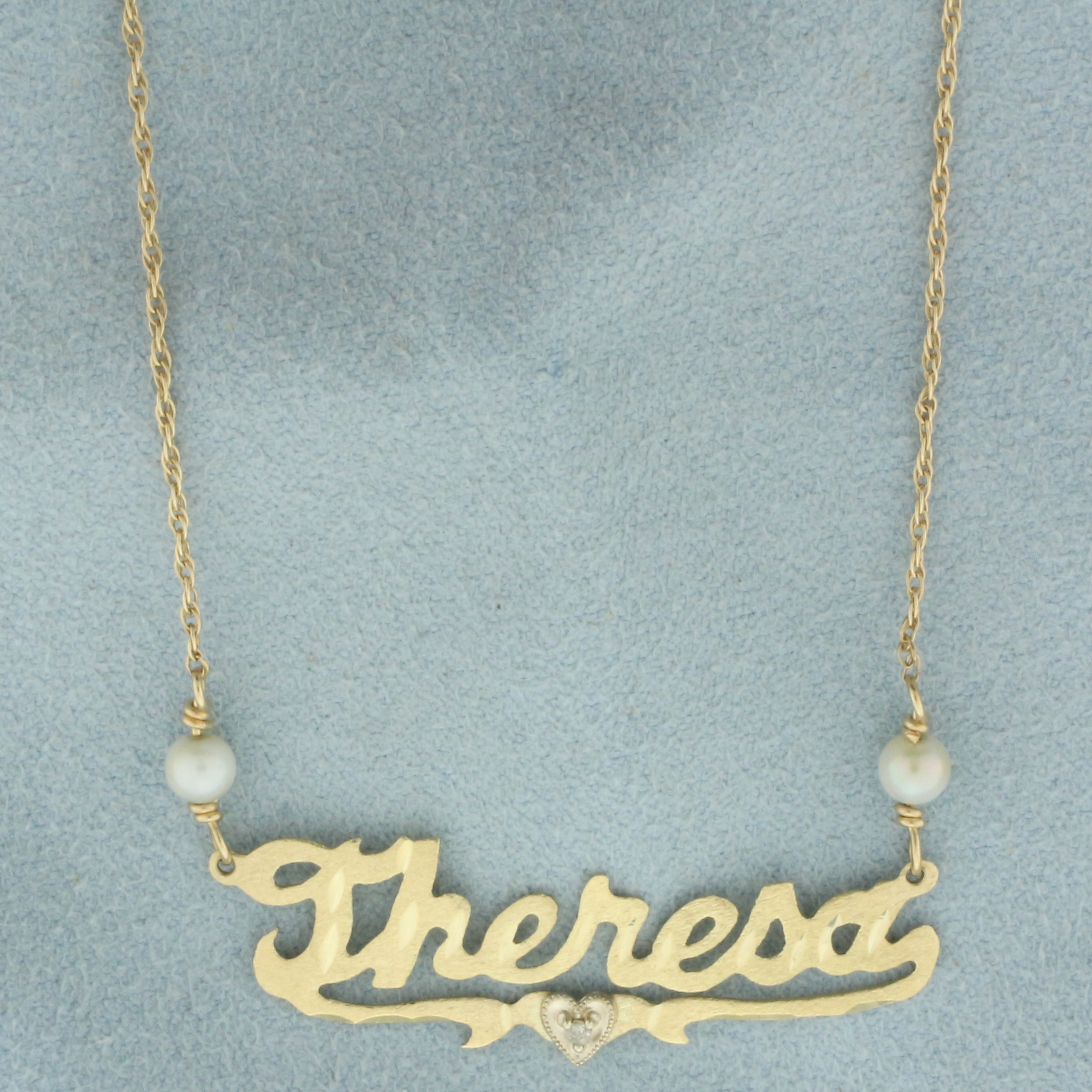 In 14k Yellow Gold. Contains three high quality 3.5mm cultured pearls and one high quality 1/2pt diamond. 20 inches long total, "Theresa" is 1 1/2 inches long. Spring Ring Clasp. 2.8g.