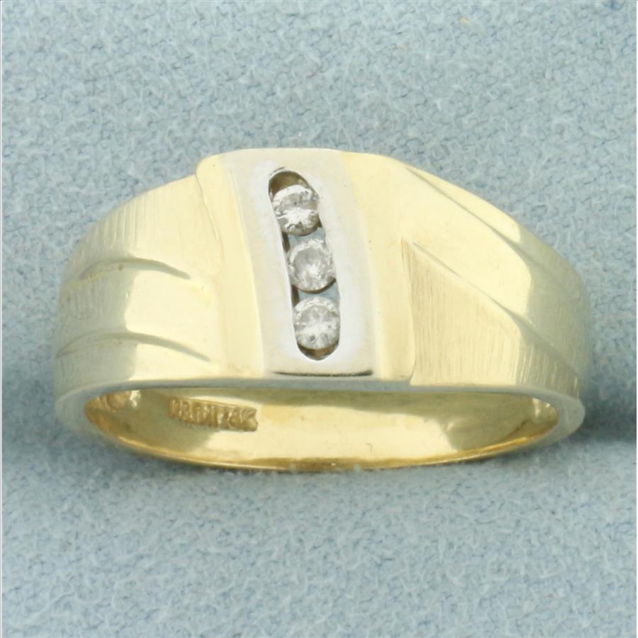 In 14k yellow and white gold. Contains three high quality diamonds, 1/8ct TW, SI2 clarity/H color. Size: 10. 6.6g.