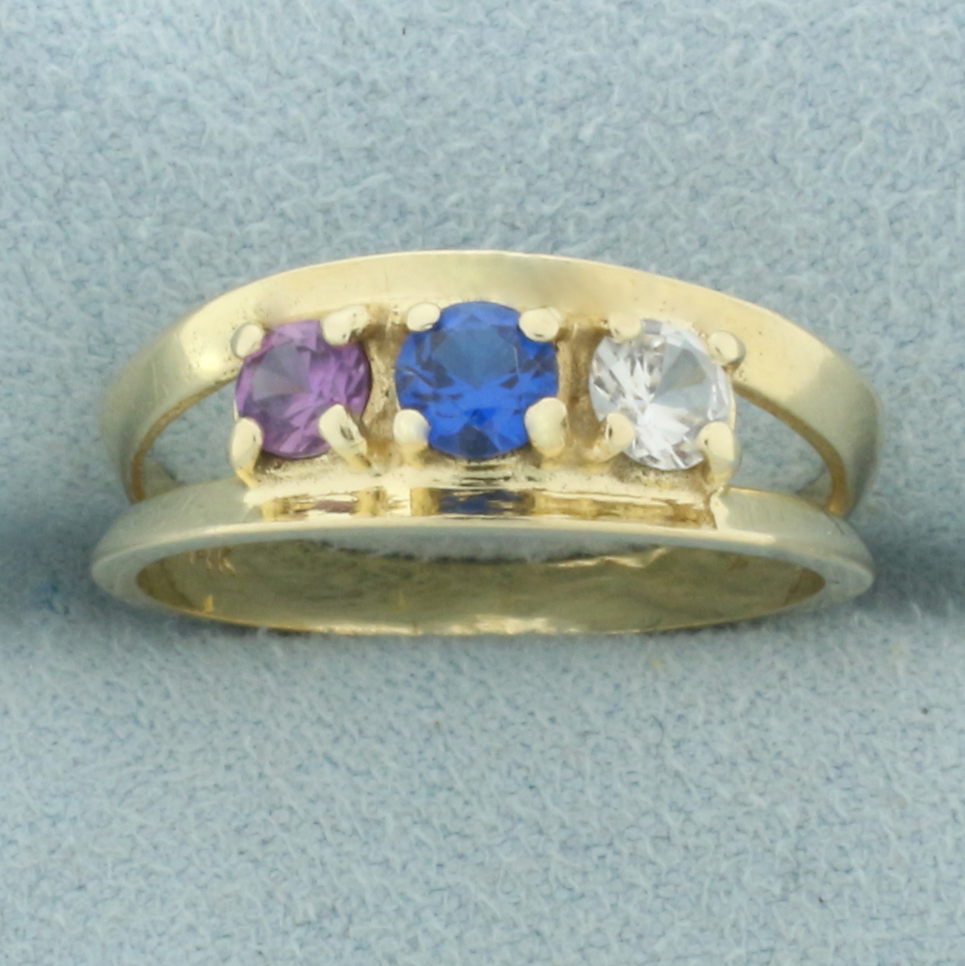 In 14k yellow gold. Contains one high quality blue, pink, and clear 4mm lab sapphire gemstones. All with excellent clarity. Size: 7.75. 2.8g.