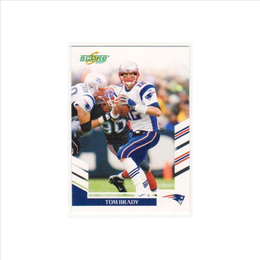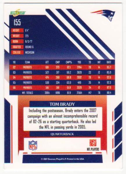This is a 2007 Score Tom Brady #155 card.  It is an approximately EX condition card of this retired NFL star.  It has minor corner wear and a light surface scuff, but overall still displays nicely.