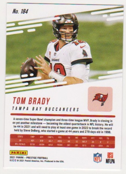 This is a 2021 Panini Prestige Tom Brady #184 card.  It is a nice looking Near Mint condition card of this retired NFL star.