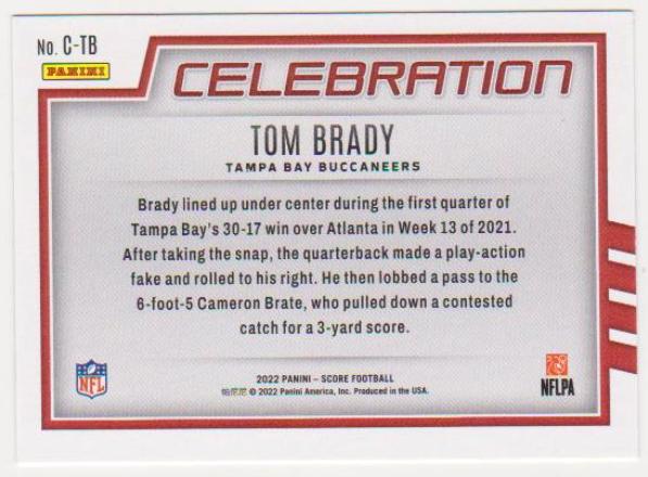 This is a 2022 Score Celebration Tom Brady #C-TB card.  It is an approximately Near Mint condition card of this retired NFL star.