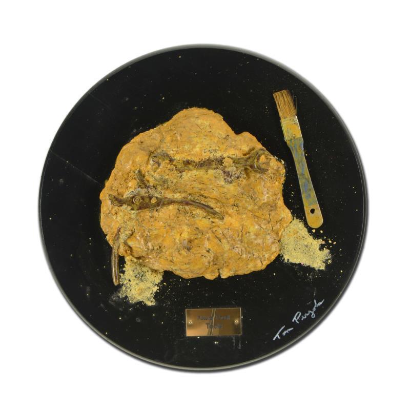 "Future Fossil: Tools" is an original mixed media sculpture by Tom Pergola, hand signed by the artist. This piece cones mounted on wood. Includes Letter of Authenticity. Measures approx. 18" (diameter) x 4" (depth).