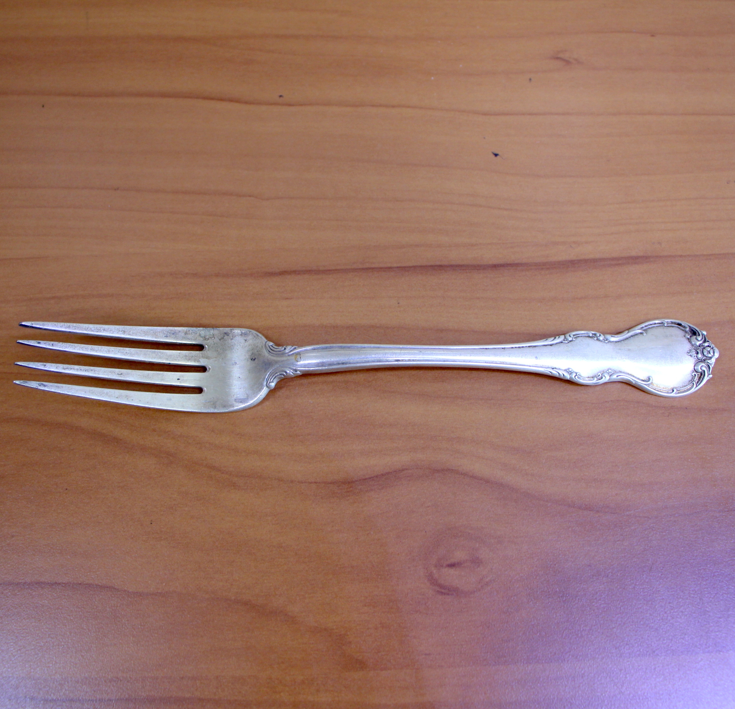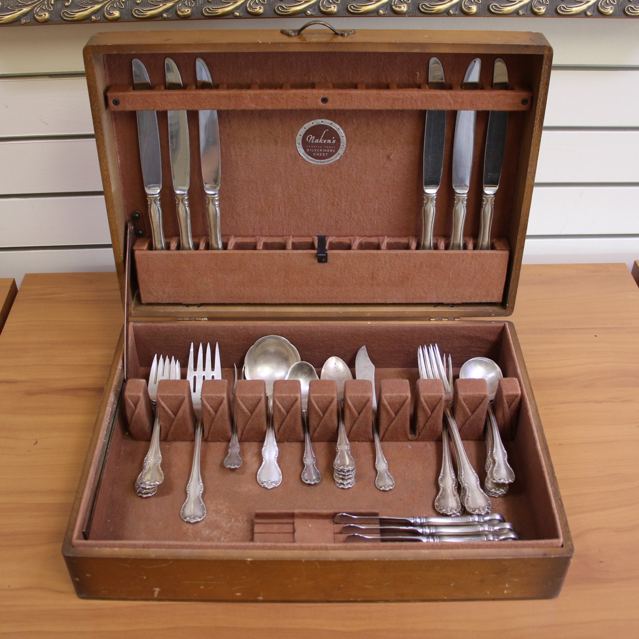 In .925 Sterling Silver. Contains six forks - 7 3/4 inches, six salad forks - 6 3/8 inches, six teaspoons - 6 inches, six round bowl cream soup spoons - 6 inch by 4 inch, six butter spreaders - 6 inch, six knifes, New French - 9.5 inches, one solid cold meat fork - 8 inch by 4 inch, one solid gravy ladle - 6 3/4 inch, one sugar spoon - 5 3/4 inch, one flat handle master butter knife - 6 3/4 inch, and one pickle/olive fork - 5 7/8 inch. Includes tarnish resistant wooden storage box. 1,851.2g.