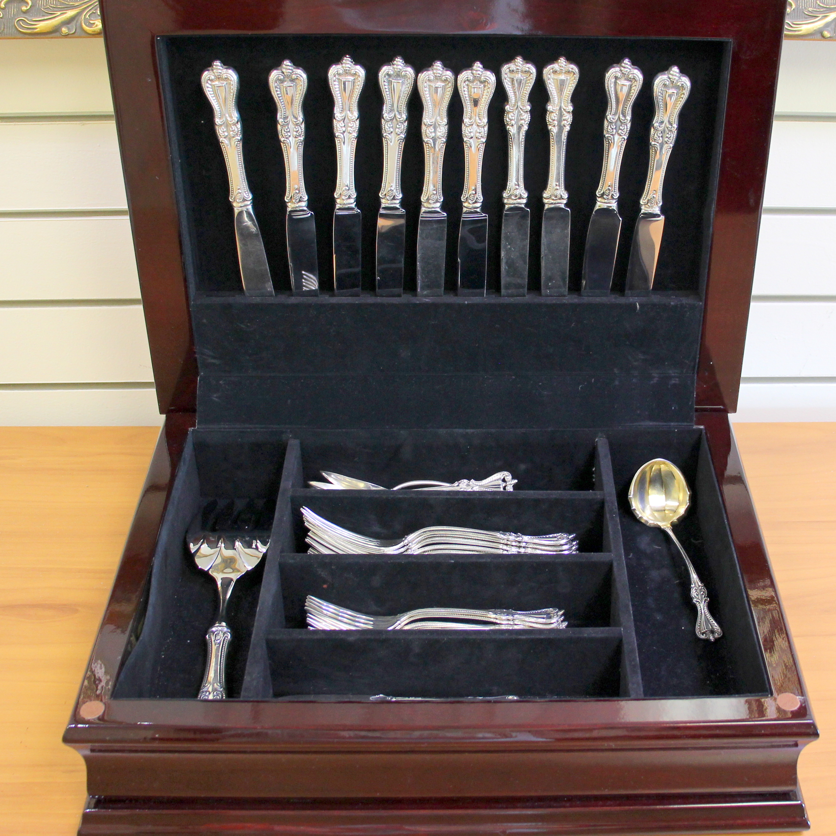 Set includes: 10 forks-7 1/8 inches, 8 salad forks-6 1/4 inches, 10 teaspoons-5 5/8 inches, 10 knives-8 3/4 inches, 9 flat handle butter spreader-5 3/4 inches, 1 solid ladle-6 inches, 1 large utility serving fork -9 3/4 inches, 1 lacquered wooden tarnish resistant storage box. (1342.2g solid sterling/715.6g ). 2057.8g.