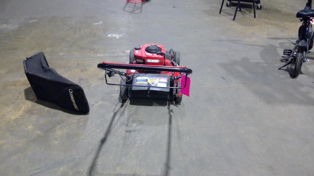 - Item info: gas powered, trigger throttle on handle, 4 wheels for easy mobility, pull starter rope, wheel locks, discharge bag, 21" cutting deck, self propelled rear bag, mulch and side discharge, 150cc, Briggs & Stratton Engine.