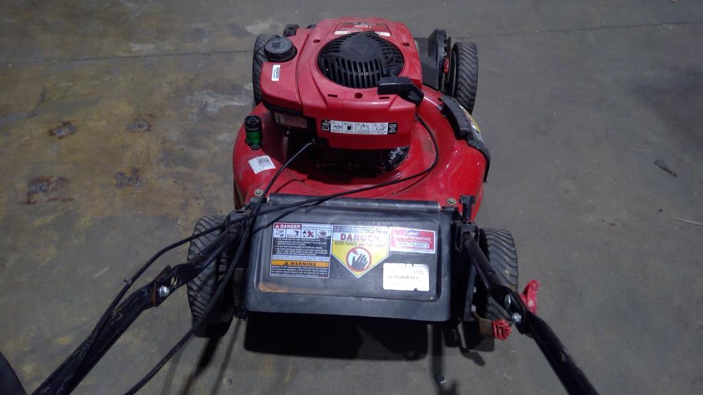 - Item info: gas powered, trigger throttle on handle, 4 wheels for easy mobility, pull starter rope, wheel locks, discharge bag, 21" cutting deck, self propelled rear bag, mulch and side discharge, 150cc, Briggs & Stratton Engine.
