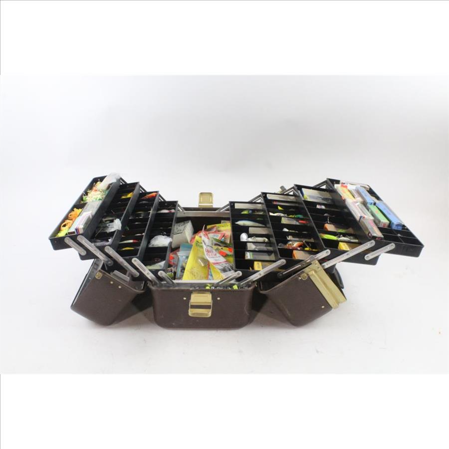 Get a great deal with this online auction for a tackle box and fishing gear presented by Property Room on behalf of a law enforcement or public agency client. - UMCO tackle box, brown, 18" x 10" X 11"