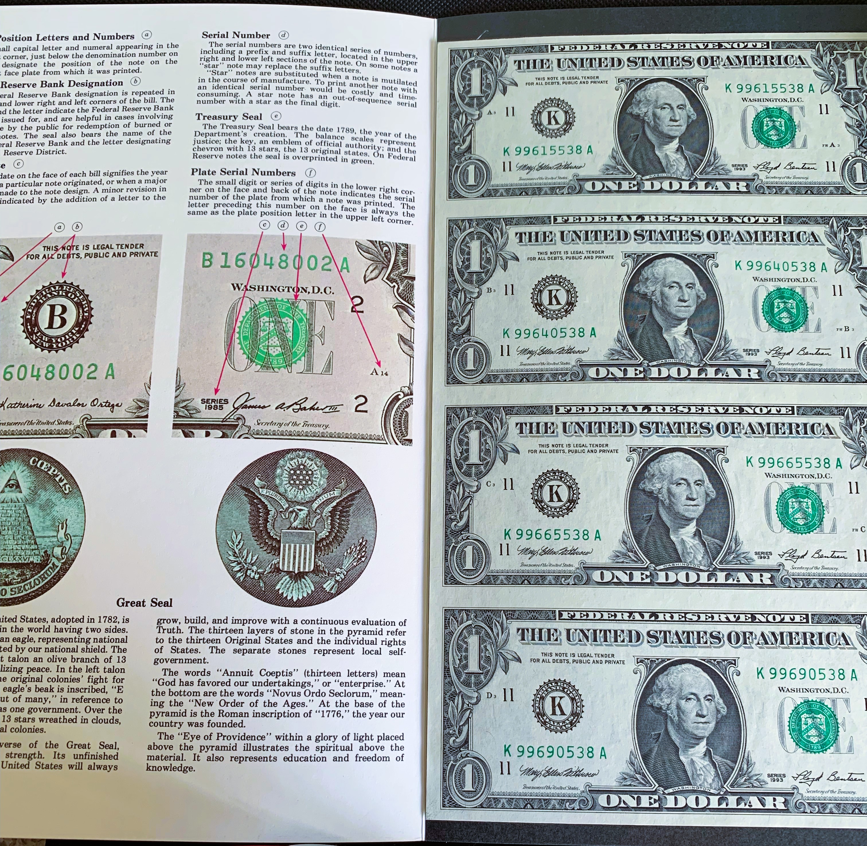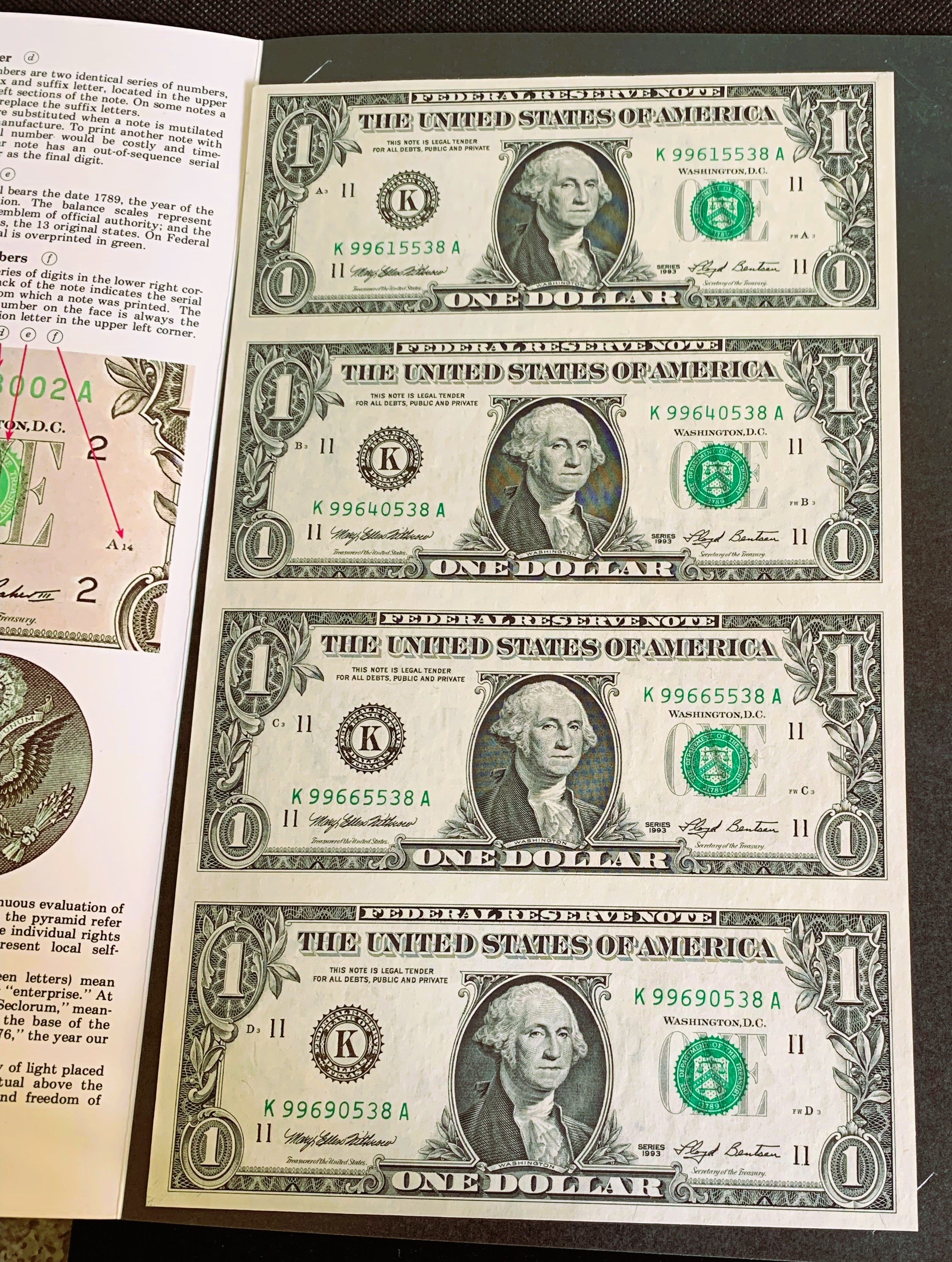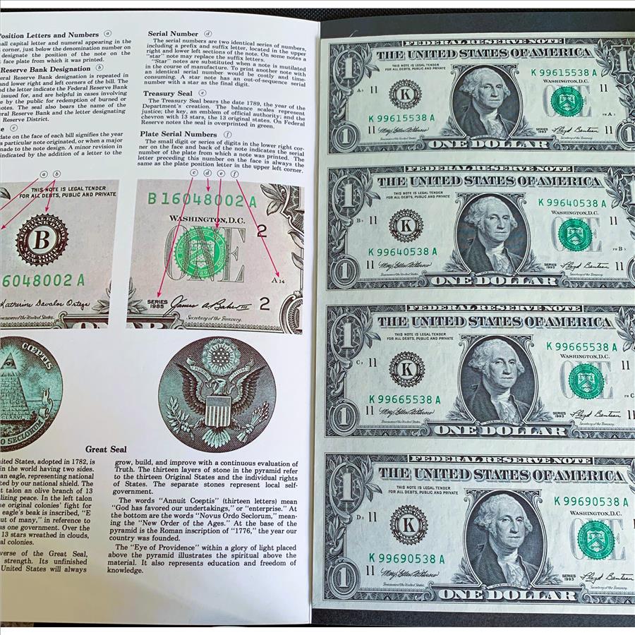 UNCUT SHEET BUREAU OF ENGRAVING & PRINTING, UNC CRISP NEW 1 DOLLAR BILLS, WIT 1ST 3 & LAST 3 SERIAL # THE SAME ON EACH BILL