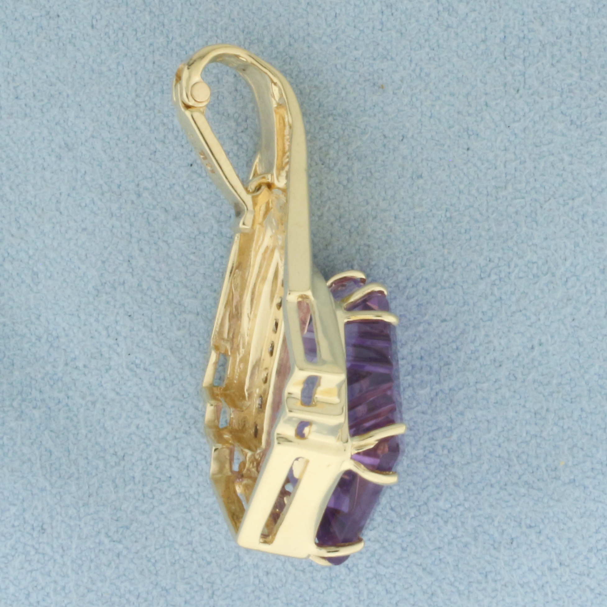 In 14k Yellow Gold. Contains one high quality natural fancy cut 19mmx15mm Amethyst gemstone with rich color and excellent clarity. Also contains seven .02ct high quality diamonds, SI clarity/H color. 1 3/8 inch long. 3/4 inch wide. Adjustable hinged locking bale. 7.0g.