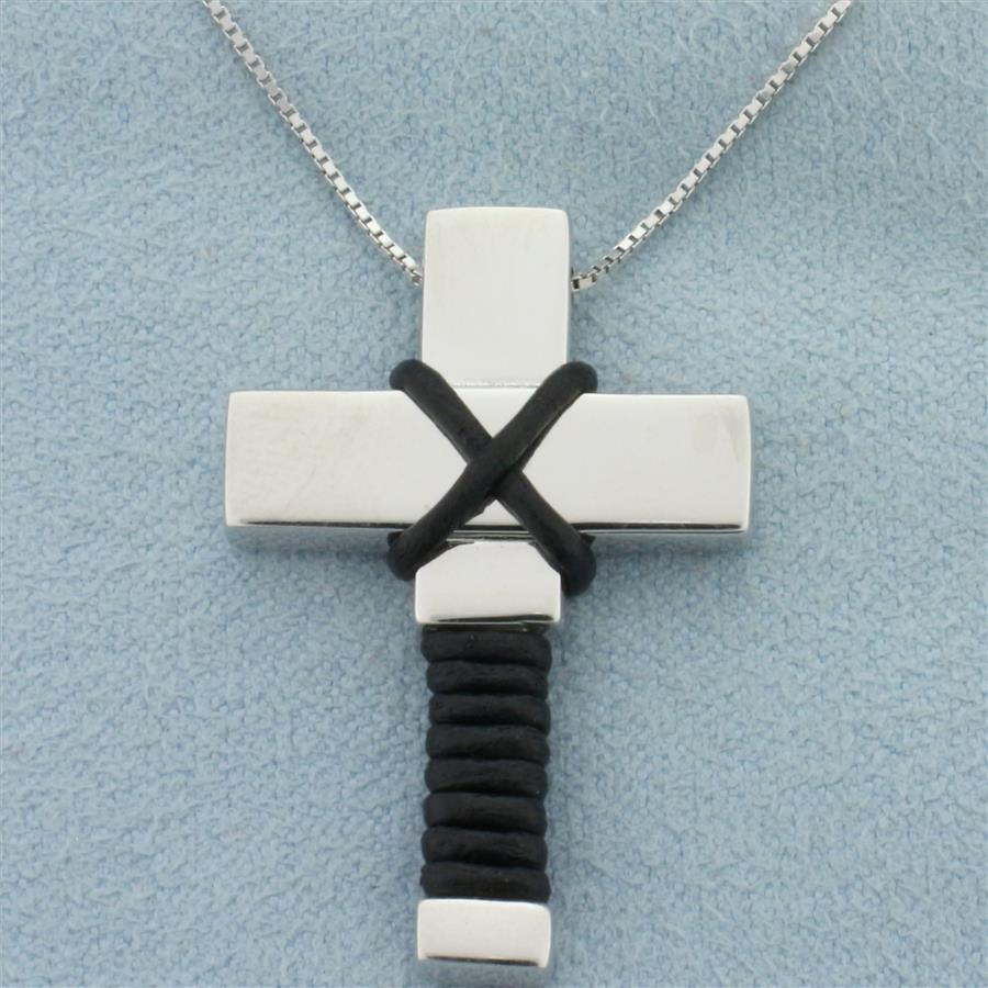 In 14k white gold. Italian made. 16.5 inches long, 7mm wide box link chain with lobster clasp. Cross measures 1 1/4 inches long x 3/4 inches wide. 5.0g.