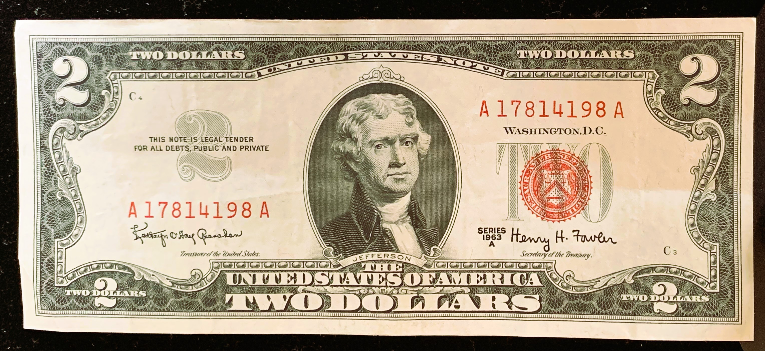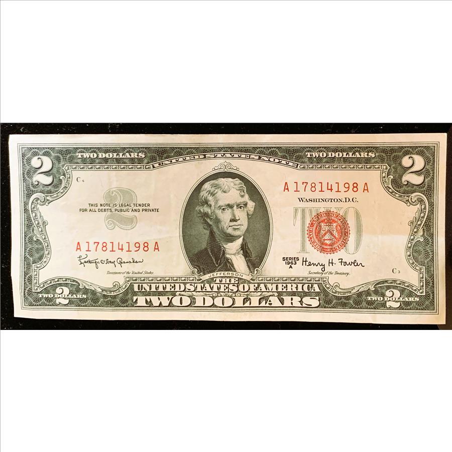 UNITED STATES NOTE, SERIES 1963 A $2 DOLLAR, RED SEAL, LOW SERIAL NUMBER, AU CRISP IN SLEVE
