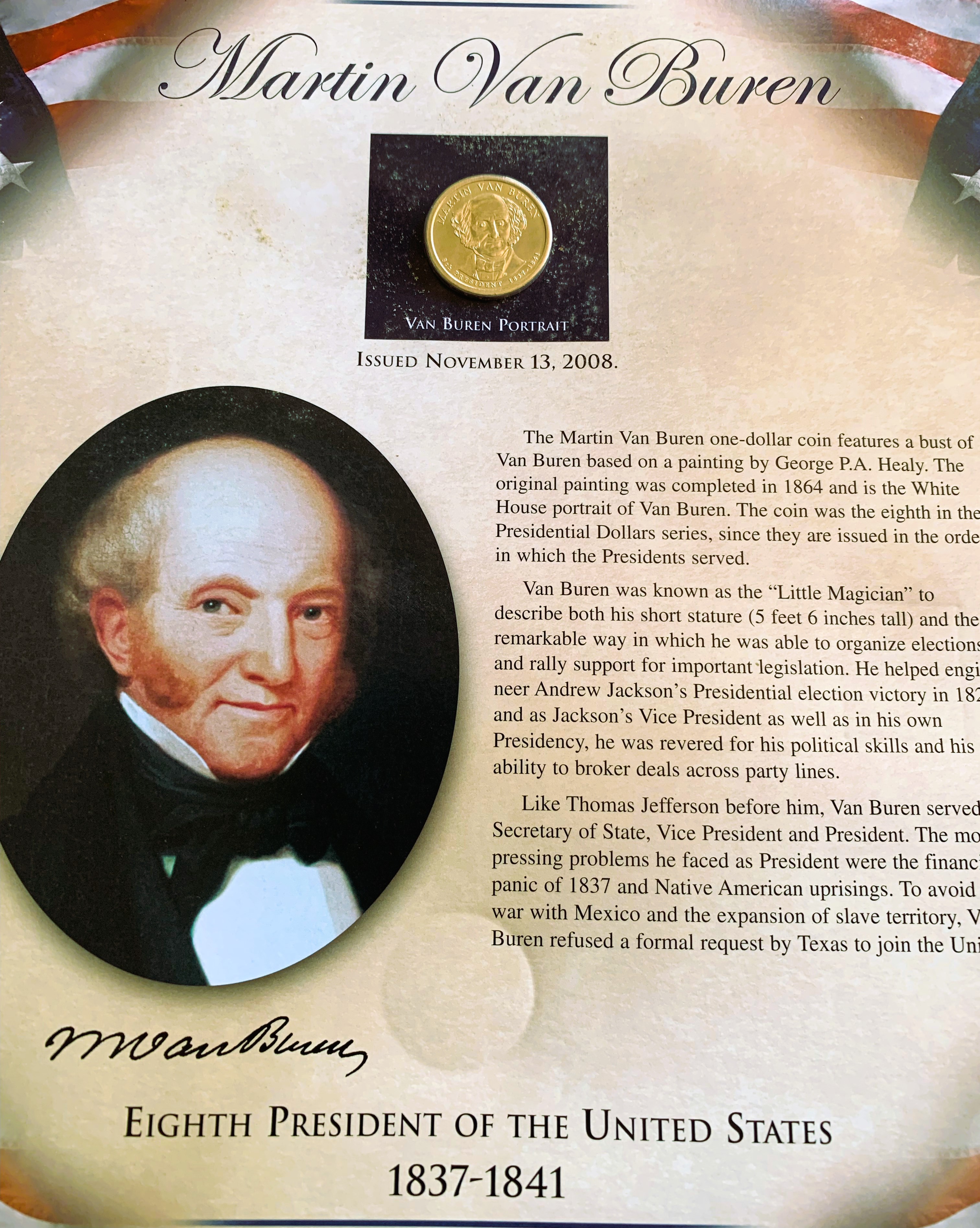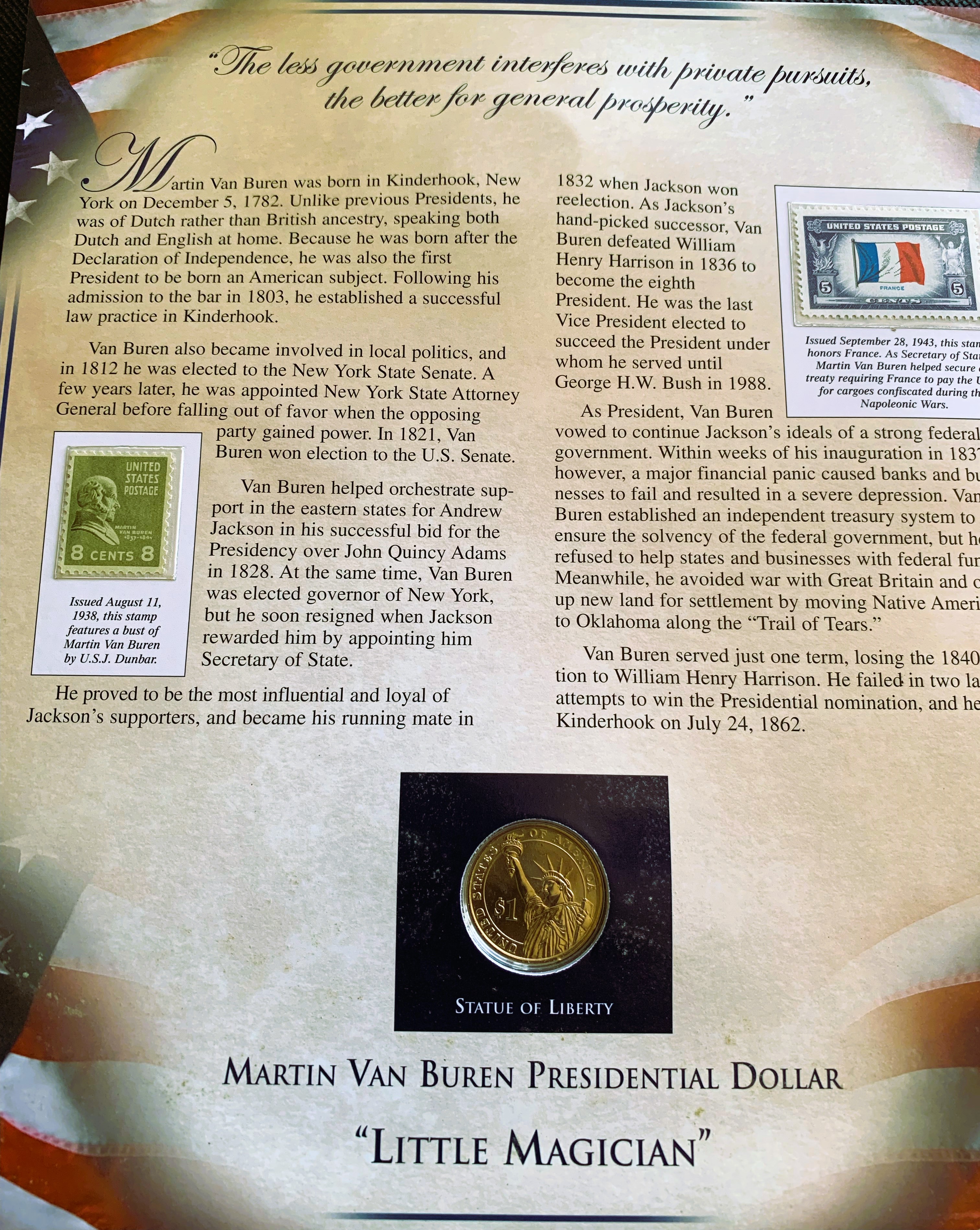 UNITED STATES PRESIDENTIAL POSTAL COMMEMORATIVE SOCIETY $1 DOLLAR COIN AND STAMPS COLLECTION, MARTIN VAN BUREN