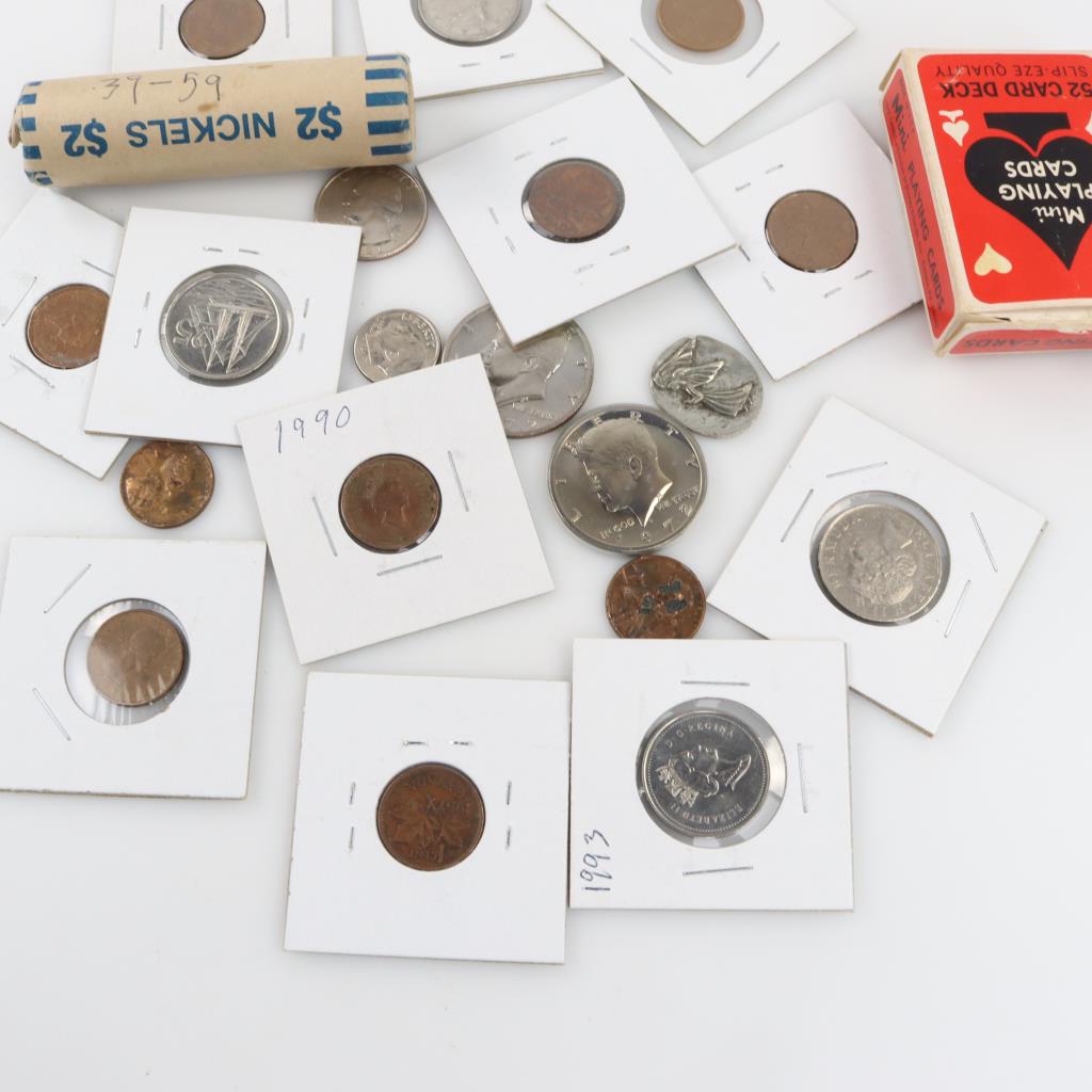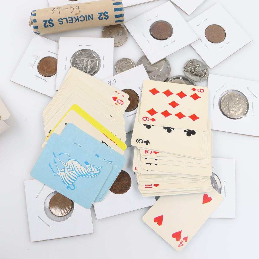 US And Foreign Coins, Tokens, With Mini Playing Cards, 15+ Pieces