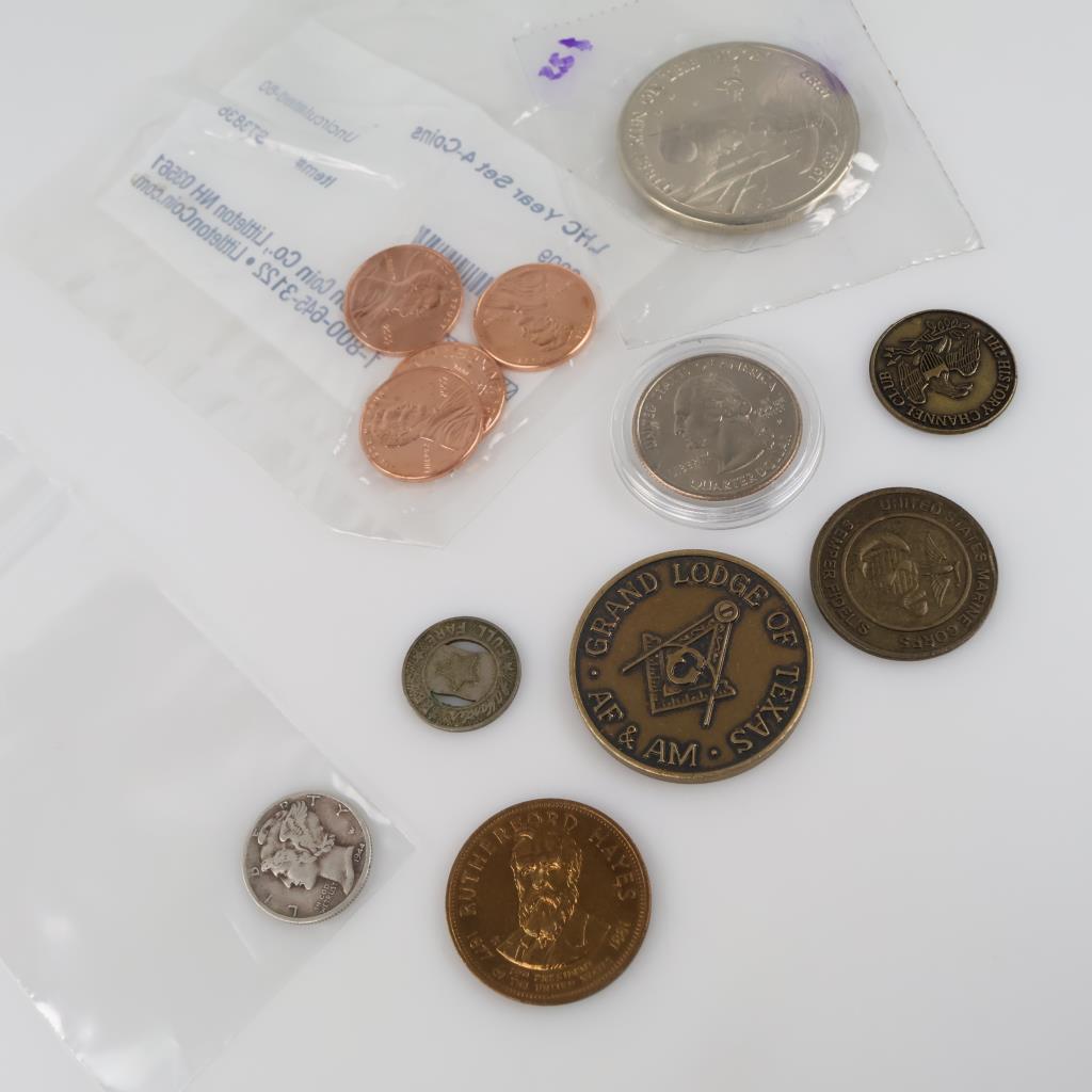 US Coins And Tokens, 9 Pieces (1 Silver Dime Included)