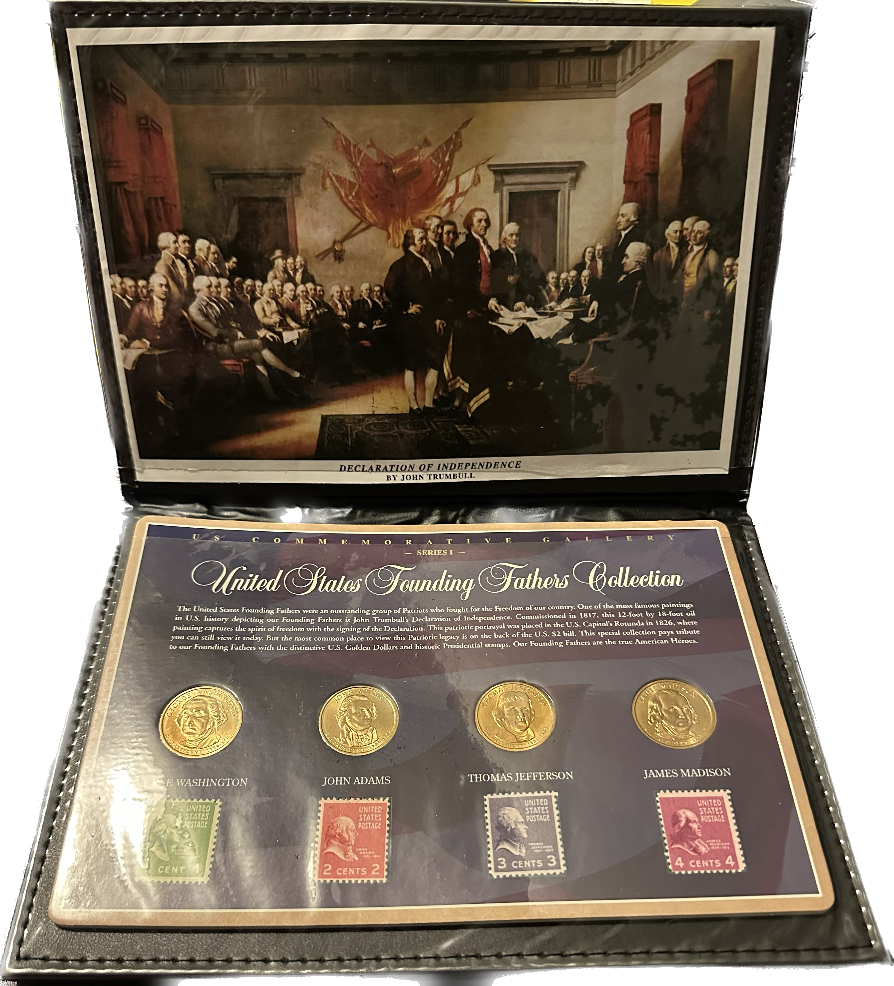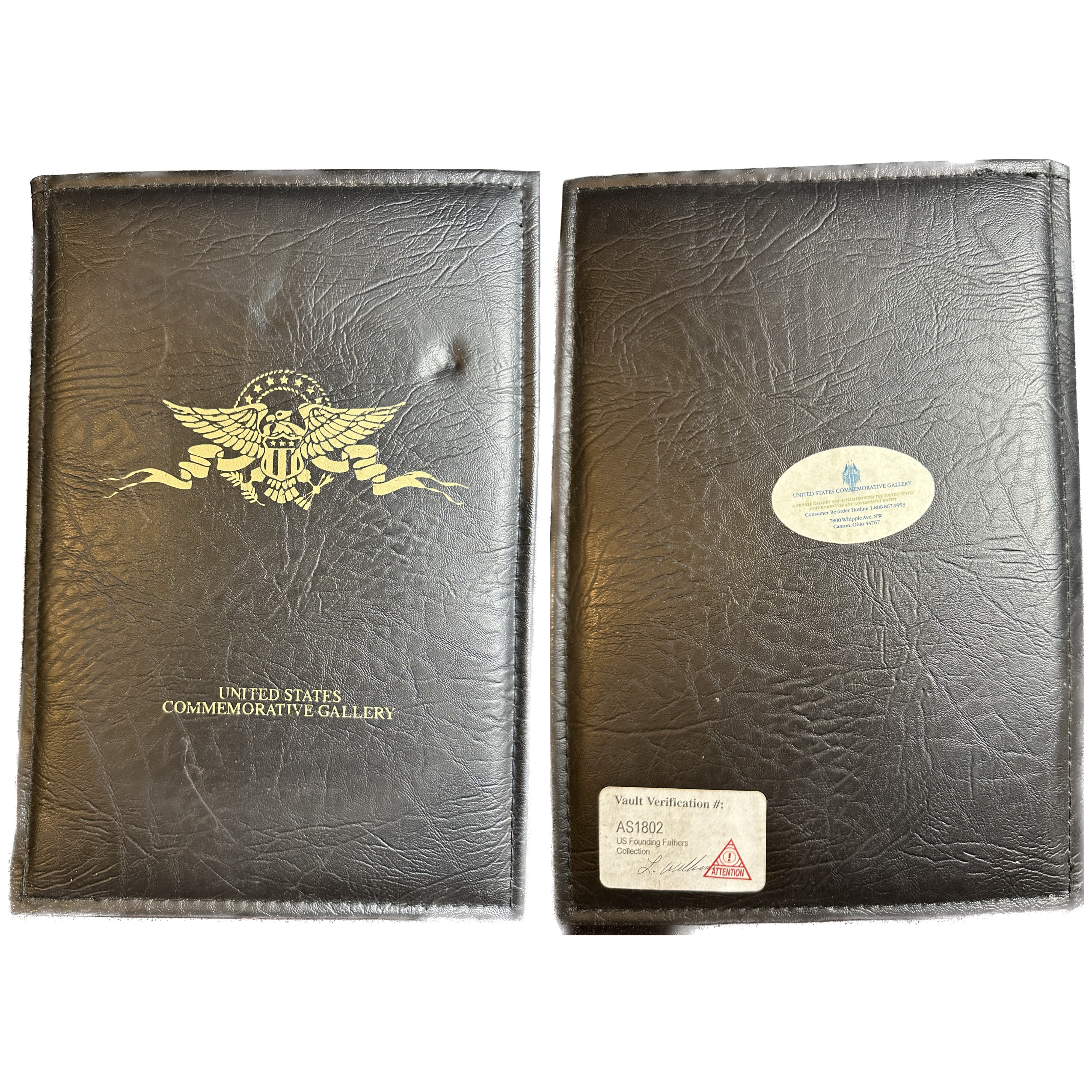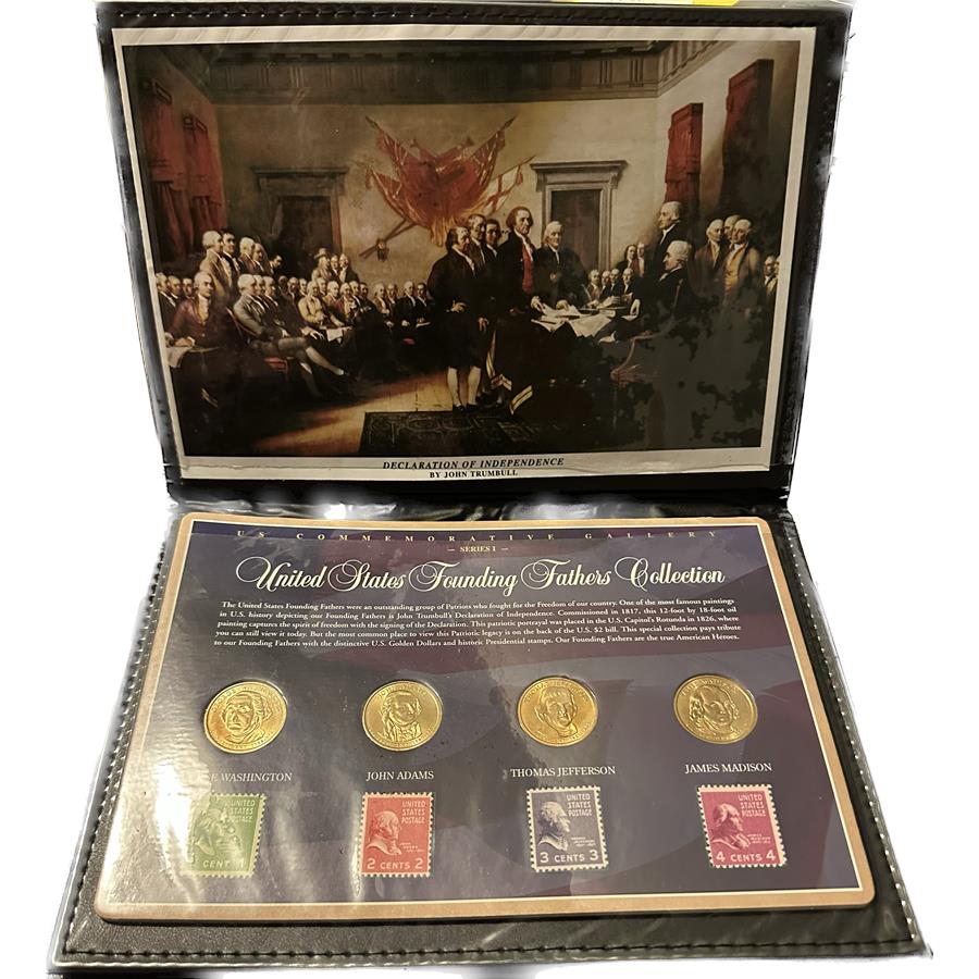 >U.S. Founding Fathers Collection - 4 Presidential $1 Coins and Stamps in Leather Bound Book - Vault Verified #AS1802