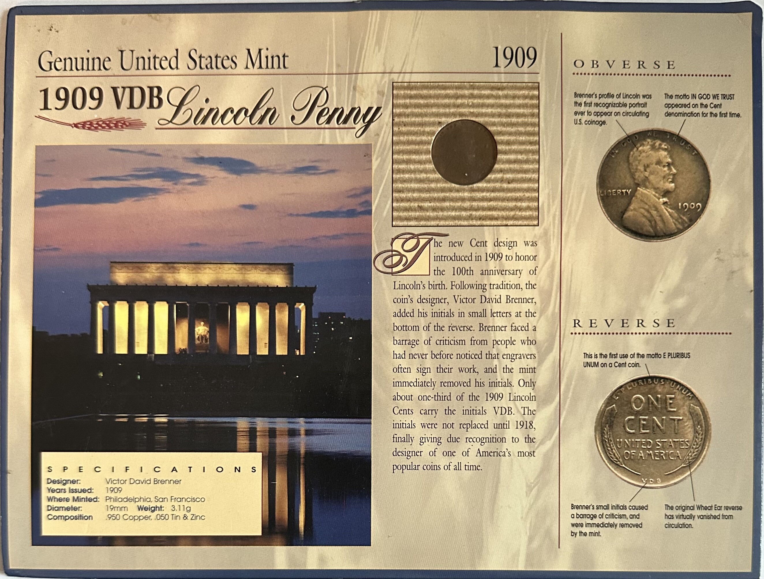 U.S. Mint 1909 VDB Lincoln Penny in Custom Display Panel with Fun Facts and COA