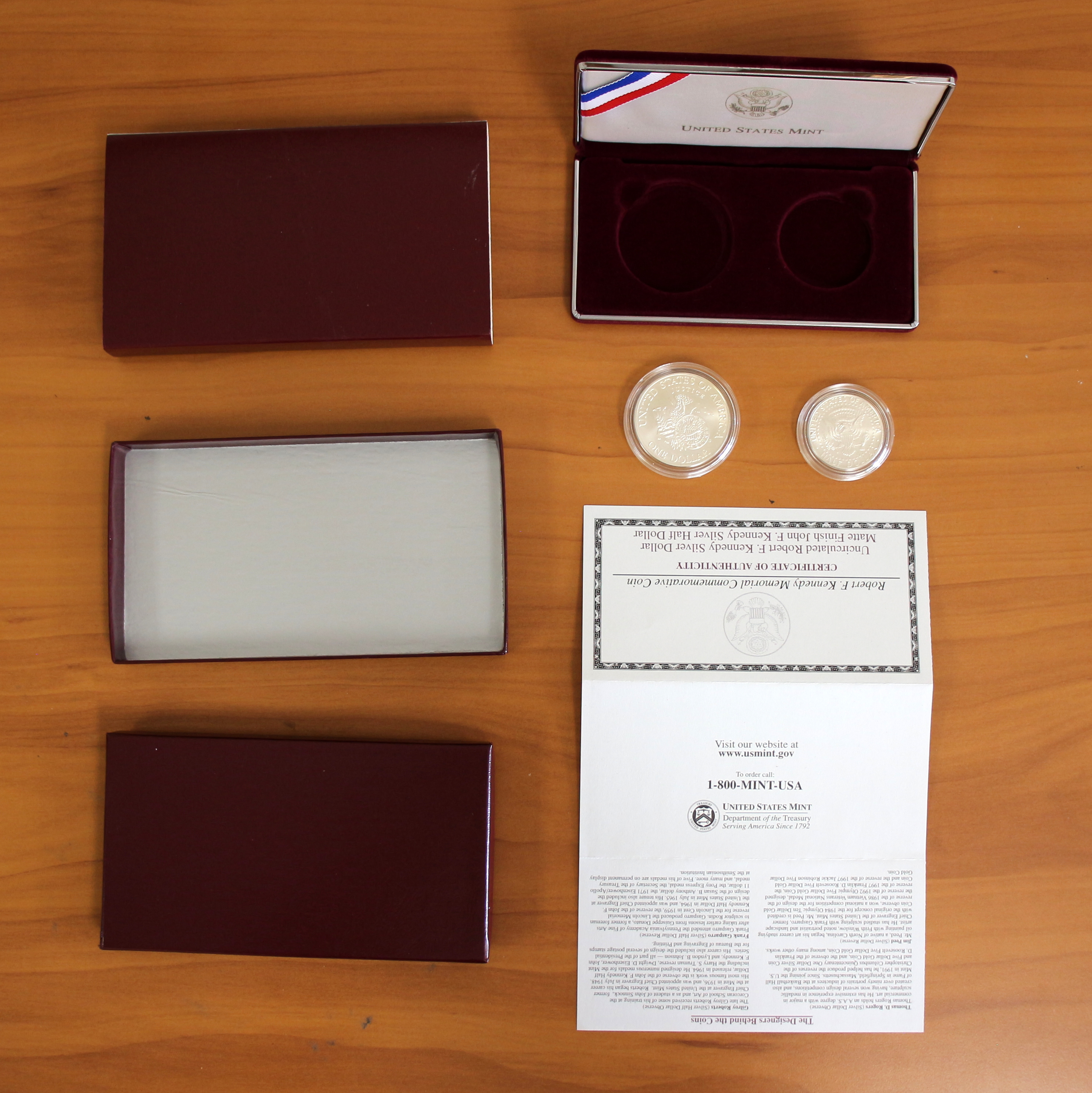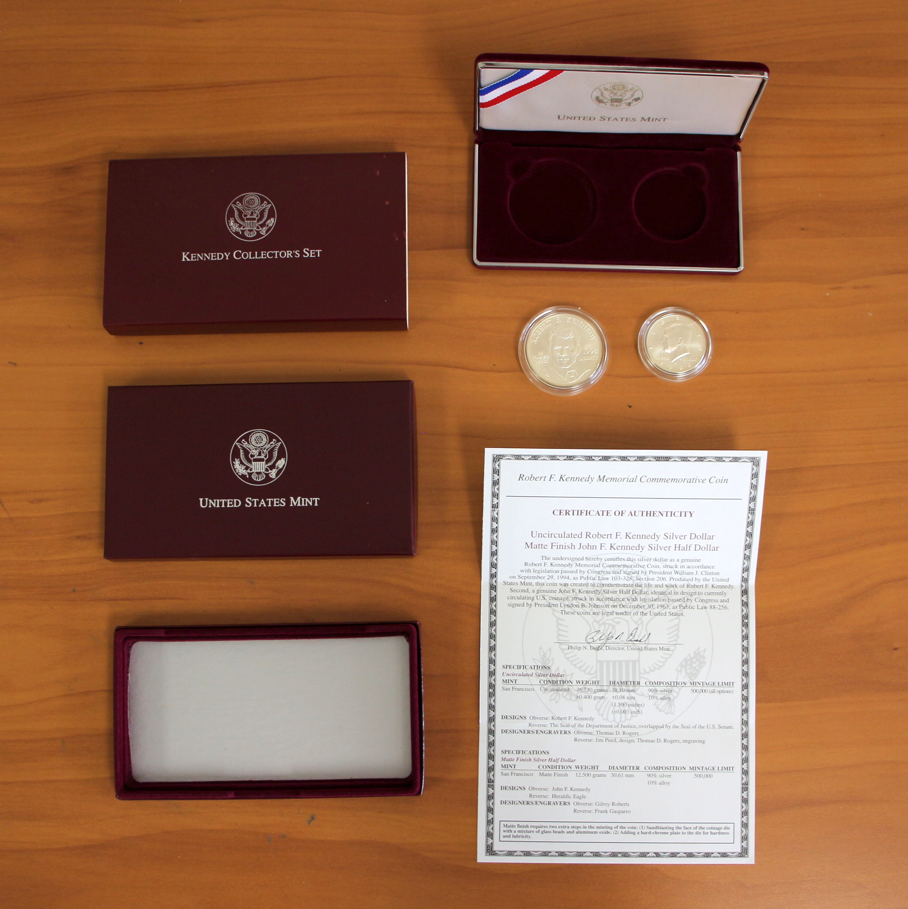 Contains one 90% Silver Kennedy Uncirculated Silver Dollar. Also contains one 90% Silver Matte Finish Kennedy Half Dollar. Includes CoA, original box and packaging.